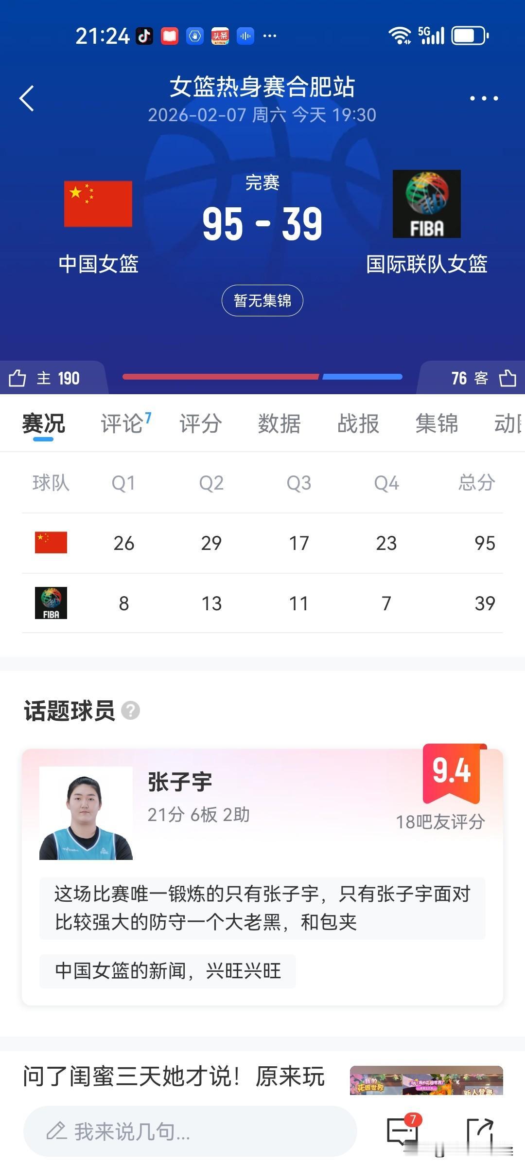 95一39,分差有点大,女篮合肥热身大胜 为备战3月份的女篮世界杯预选赛,已集训了一段时间的中国女篮,今天进行了第一场热身赛,对手是世界联队,从纸面实力来说,这个世界联队应该有欧洲二流球队的水平。中国女篮新人居多,内线韩旭李月汝均未归,陈明伶张子宇李宇彤主打内线,后卫线杨舒予领衔,大运会上一些发挥出色的球员入选。老将张茹当选,防守有保障。 世界联队应是配合不行,亦或是初来乍到,场上表现用一般形容都不及。其多次外线投出三不沾,运球被断,篮下被帽,中国女篮乘机反击打的有声有色,屡有斩获。张子宇纵使在对方包夹下也能得手,虽有走步失误,但亦可忽略。中国女篮得心应手,终获大胜。第一节和弟四节,中国女篮将世界联队的得分压制在个位数,展现了防守的强韧。 不过本场比赛,女篮队员在张子宇在场时,如何更有效的将球给到张子宇,张子宇在被包夹上篮困难时如何分享球,是比赛中暴露的问题。面对更快速灵活的亚欧队伍时,张子宇的优势如何显现?这应该是主教练宫鲁鸣思考的问题。 篮球友友们,你们说呢? 女篮实力分析 女篮海外征程 女篮对抗赛 女篮对比