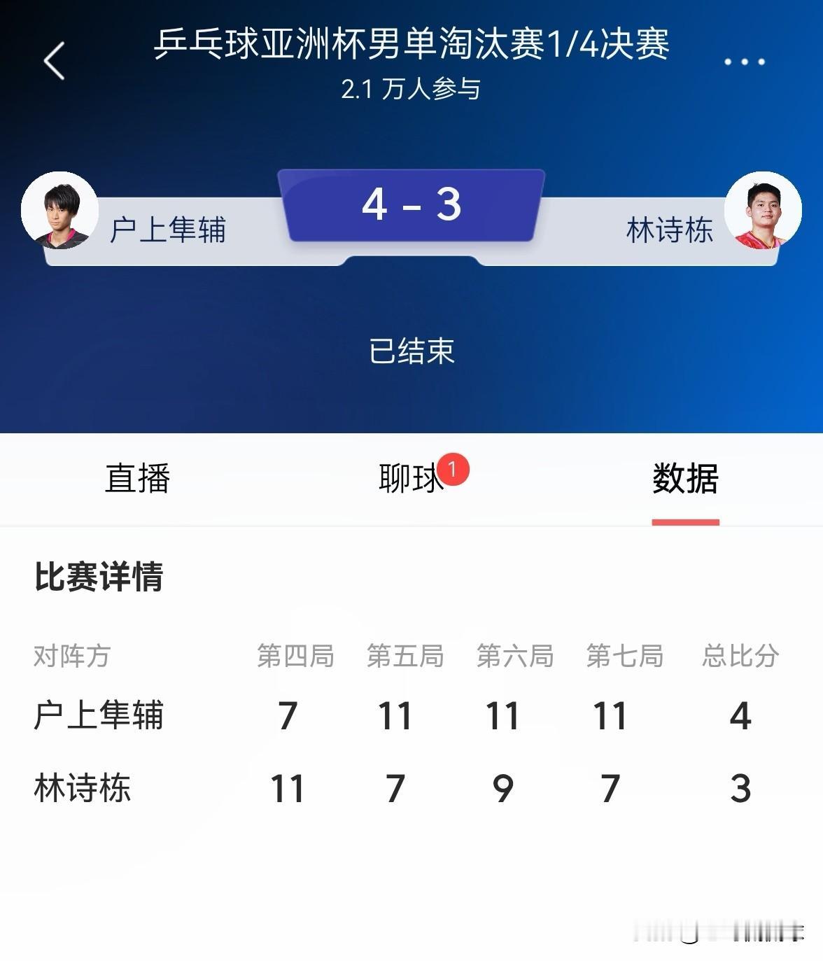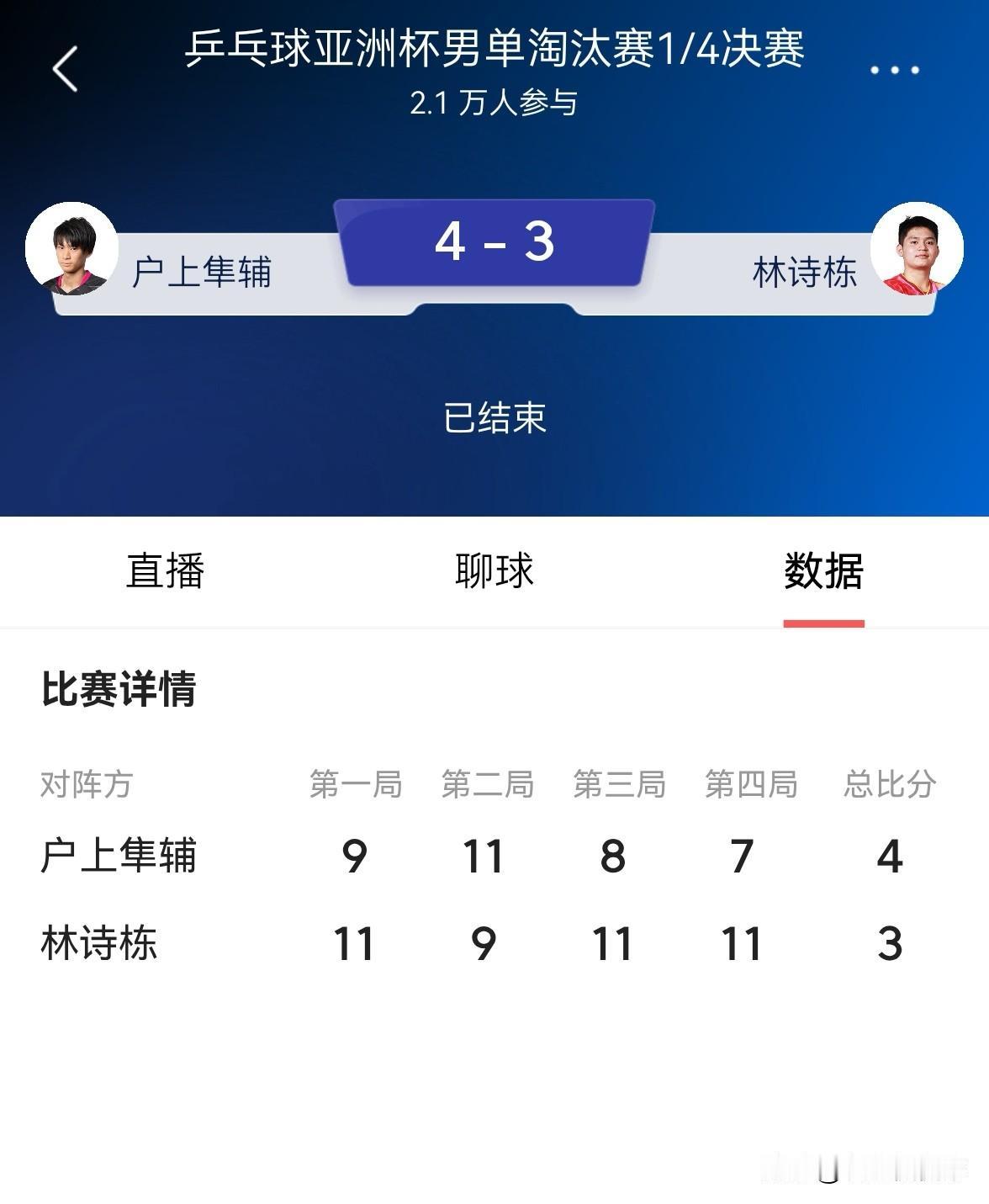 中国男乒名将林诗栋真是让人极度的失望!在今天结束的一场乒乓球亚洲杯男单1/4决赛中,林诗栋迎战日本选手户上隼辅,让人感到极度失望的是,林诗栋在一度3:1领先对手的大好局面下,竟然连输三局,最终以3:4不敌对手无缘本届赛事的男单四强。 对于林诗栋在本场比赛中的表现,我真是忍无可忍,林诗栋一次又一次的在关键比赛中输球,试问这样的球员如何能够扛起中国男乒的大旗?