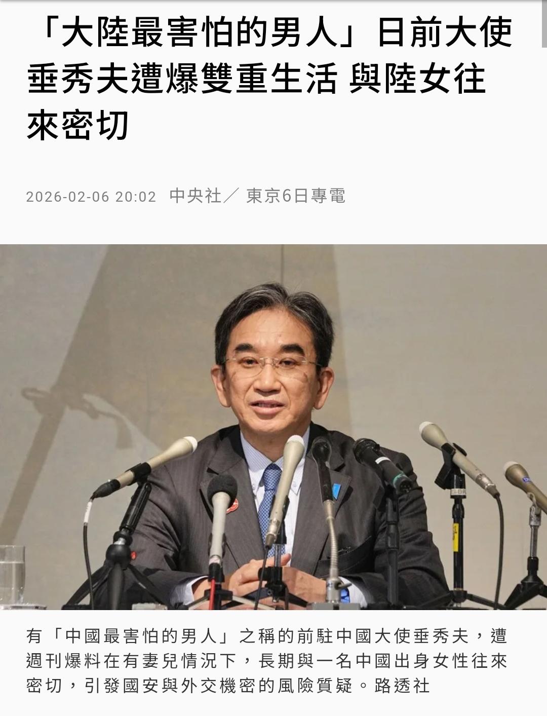 日本周刊报大瓜:垂秀夫跟一名中国籍女子保持长达10年的不正当关系 日本周刊“News Postseven”今天报导,周刊去年12月与今年1月跟拍垂秀夫发现,他多次前往中国出身A小姐与其子女居住的东京某公寓过周末,不仅一同进出,还留宿过夜。不过,他与A小姐及孩子出门时,会刻意不交谈、假装不认识,显示对于关系曝光抱持高度警戒。 根据周刊调查,垂秀夫疑似自现役外交官时代起便维持“双重生活”,媒体取得两张早年合影,有垂秀夫与A小姐及一名幼童在酒店居室内,以及3人并肩在户外长椅上的合影,气氛亲密自然。照片中的幼童,与现今A小姐的孩子长相相似,若照片属实,依孩童年龄推算,可能拍摄于数年至10年前,显示两人往来时间可能是垂秀夫还在中国担任外交官时期。 A小姐面对周刊采访时,否认两人交往,称“只是普通朋友”,但表示酒店居室照片拍摄时“丈夫也在现场”,并称丈夫是中国人,等同承认照片真实性。然而周刊追踪显示,目前实际出入该公寓的男性仅有垂秀夫一人,没有看到所谓的“中国籍丈夫”。 说几句: 垂秀夫,一个从身材到长相,再到言论举止,都堪称下下品的男人,能瞧得上这么个只打嘴炮的小蝌蚪的女人,不管是哪国人,品味都让人着急。而且《联合报》还给他安了个让全体东大人惊掉下巴的前缀——“大陆最害怕的男人”。我C!不知道它们是怎么想的?难道是因为他是“弱势群体”,而我们对弱势群体有天生的怜悯,从不把它放在眼里,所以它很飘,就像阿飘一样?否则,我想不出来,我们为啥“最害怕”他? Source: X