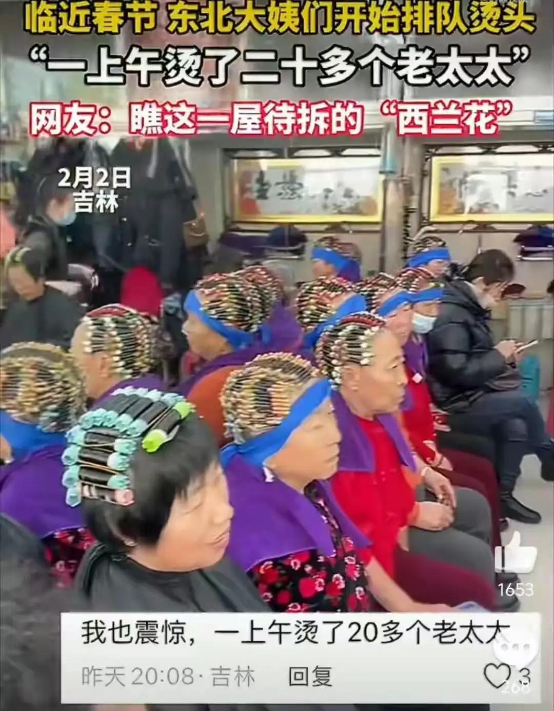 不知道从什么时候开始东北大姨喜欢烫头了? 这临近过年了,东北大姨也是扎堆烫头,并且理发店还是人挤人的状态,难不成在东北有这种习俗吗? 网友发出在理发店看到的那一幕,简直是不可思议,烫头的大姨那是一片又一片,小小的理发店更是坐满了大姨,网友喊话,一起烫个西兰花好过年。 理发店中的发型师,那是根本忙不过来,连喝口水的功夫都没有,或许是在东北他们的习俗,大家也都知道,正月不剃头是老一辈传下来的。新年到了,自然也是要从头开始图一个好彩头。 想想也是,顶着一头蓬松的卷发,走亲访友起来也是精神气十足。 不知道你们那的大姨过年也会去烫头吗?