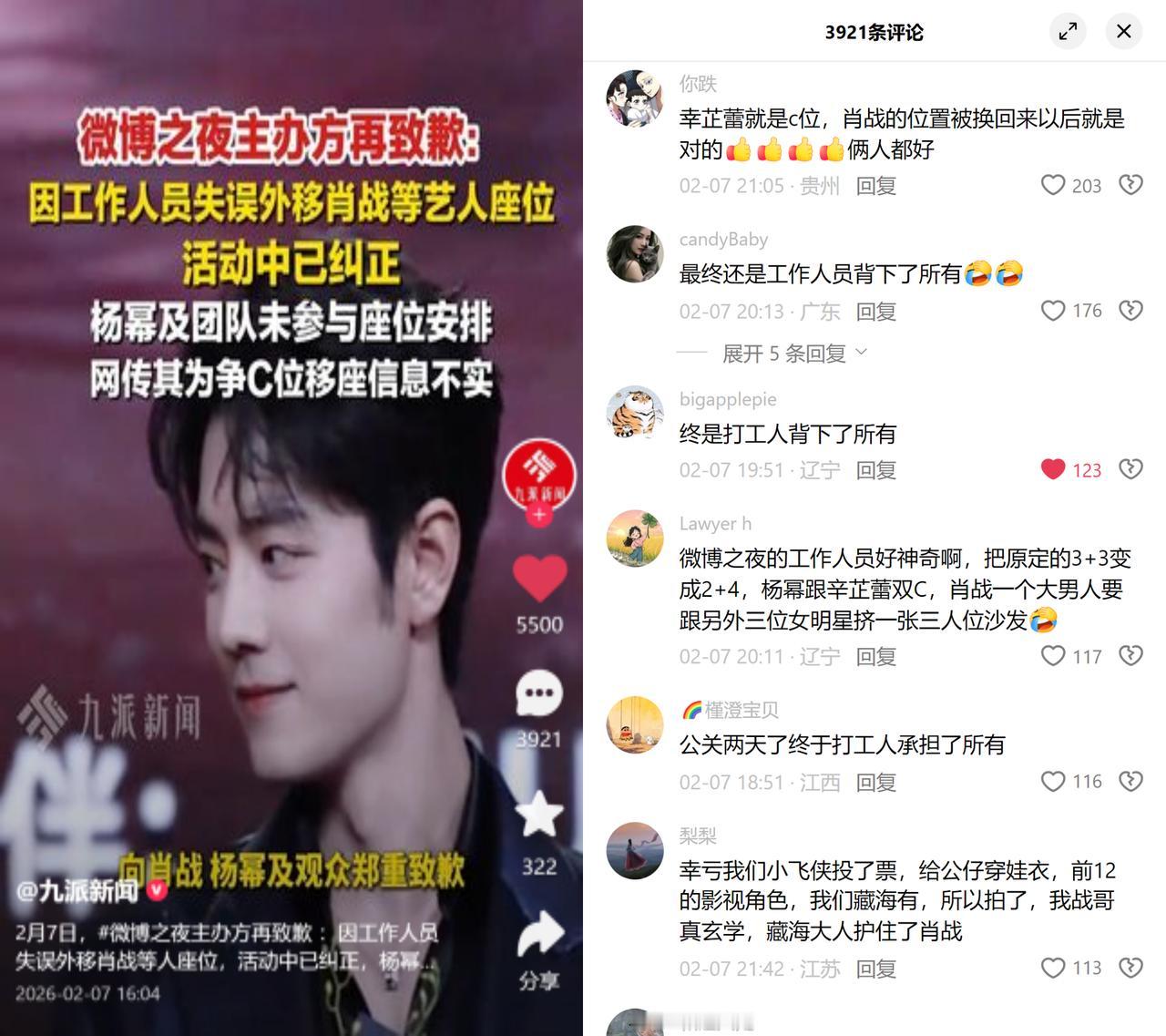 微博之夜座位风波,打工人背锅 主办方两次致歉,一口咬定是工作人员失误:把原定3+3的座位改成2+4,肖战被挪去凑四人座,辛芷蕾和杨幂成了双C,闹到肖战当场站着不肯落座,最后又匆匆改回原位。但大家根本不买账,留言里全是终是打工人背下所有的嘲讽。 这事儿看着荒唐,背后透着娱乐圈的老规矩。C位早就超越了普通座位,代表着咖位、流量、商业价值的脸面。排位错了,粉丝要维权,品牌要追责,主办方得罪不起任何一方,只能把锅甩给最没话语权的底层工作人员。 说白了,这就是成熟的公关套路:用一个无名背锅侠,抹平所有矛盾,保住各方的体面。大家骂的哪里是那个可能真手滑的工作人员,反感的是这套有事找底层的潜规则,毕竟能决定C位的,哪能是贴姓名贴的人。