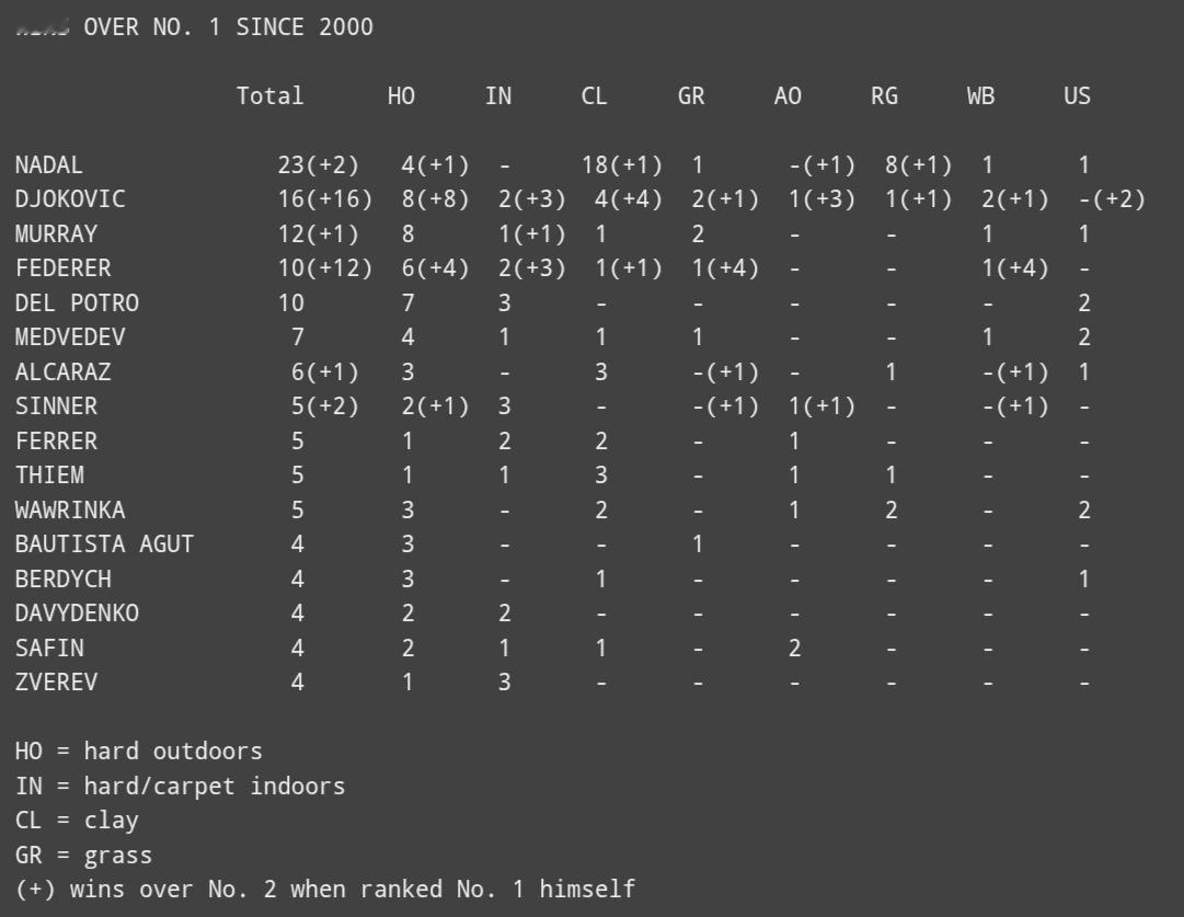(括号内数字为本人作为top1战胜top2)土神:23胜(2),大满贯10胜(2)德约:16胜(16),大满贯4胜(7)费德勒:10胜(12),大满贯1胜(4)穆雷:12胜(1),大满贯2胜德尔波特罗:10胜,大满贯2胜阿卡:6胜(1),大满贯2胜(1)