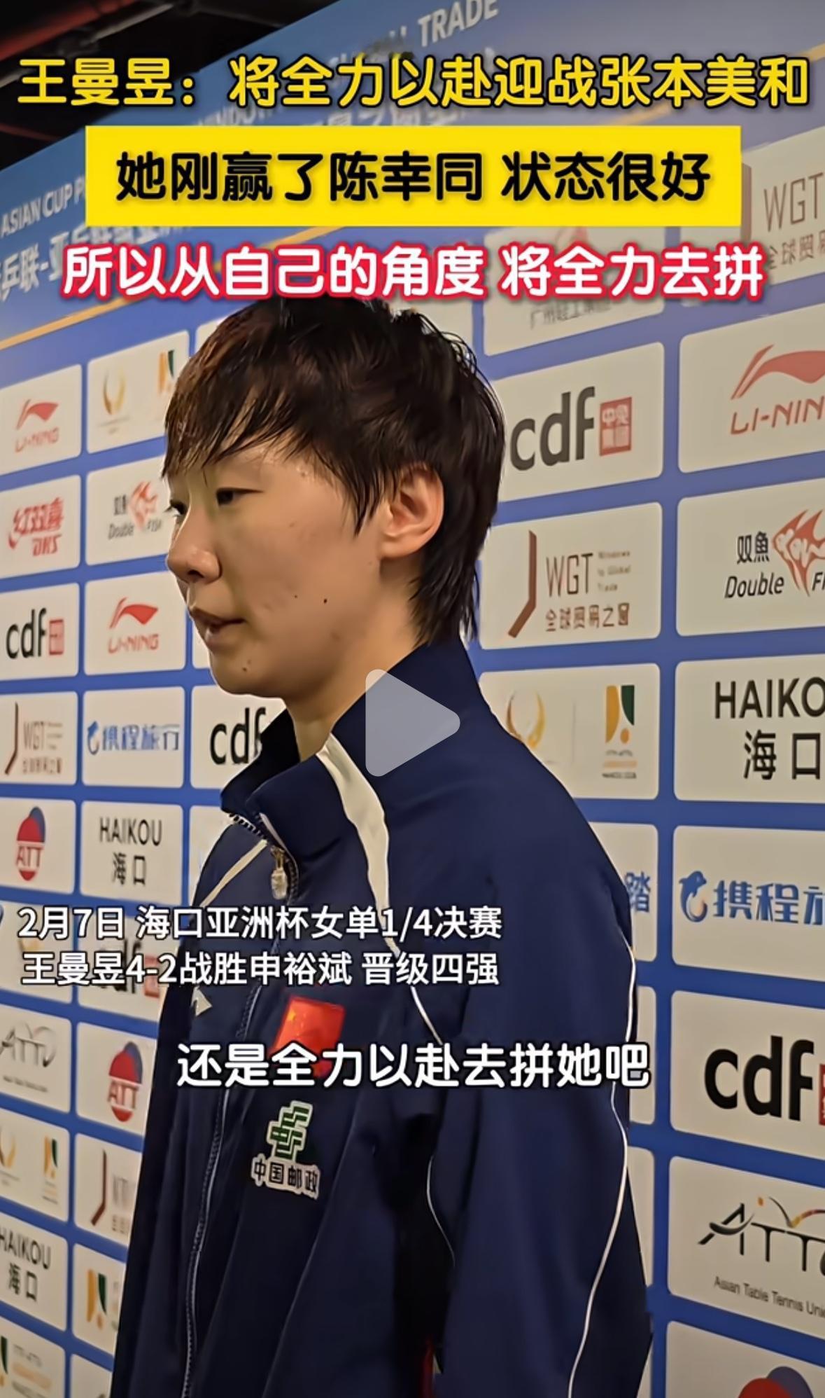 王曼昱4:2申裕斌进四强后表示:全力以赴迎战张本美和! 海口亚洲杯,王曼昱4:2申裕斌晋级女单半决赛,再次遇到张本美和, 王曼昱表示, 将全力以赴迎战张本美和, 她刚赢了陈幸同, 状态很好👍, 所以要从自己的角度拼她! 希望王曼昱顺利打败张本美和, 与孙颖莎或蒯曼会师决赛, 曼昱要一分一分扣细了打, 耐心的打, 稳住心态, 全力迎战张本美和, 别给自己太大压力, 稳扎稳打, 加油曼昱!