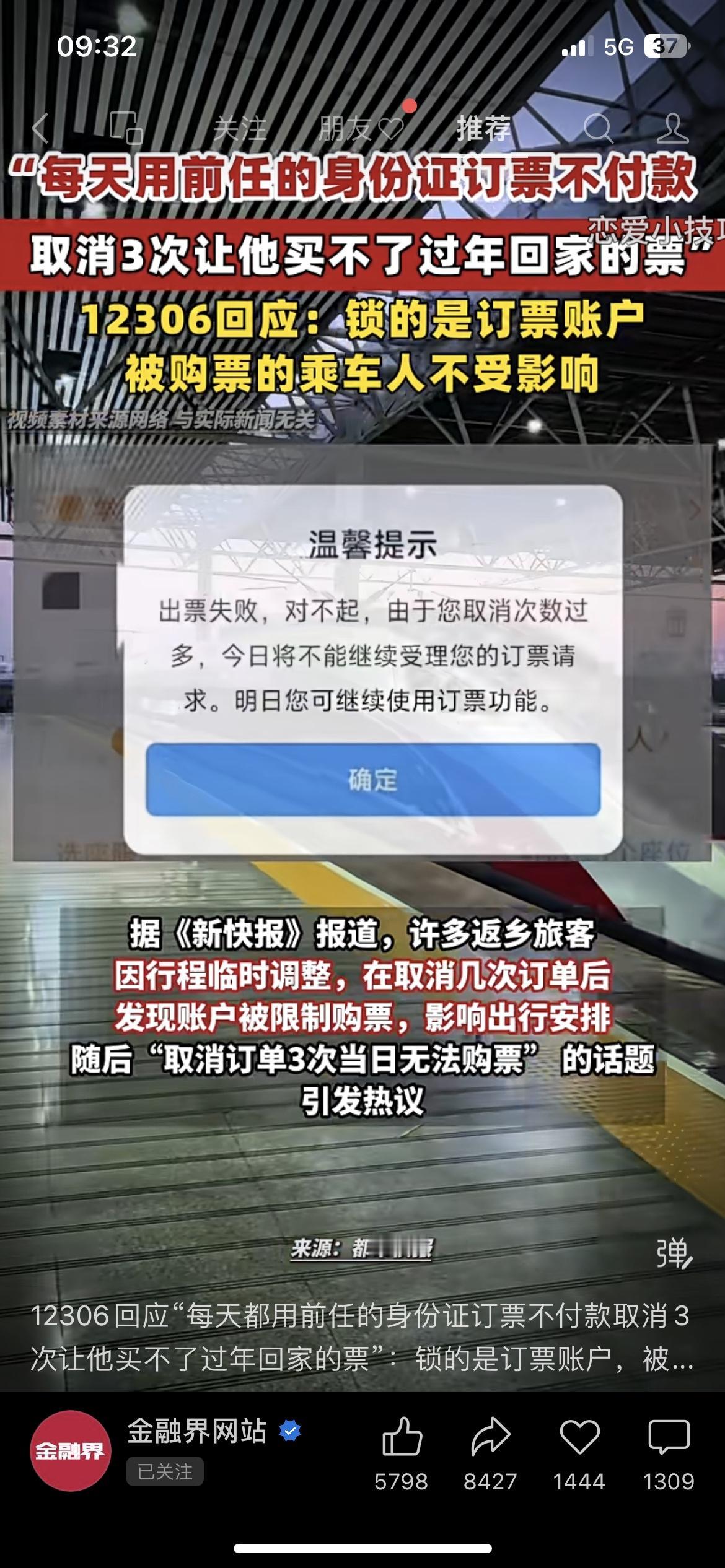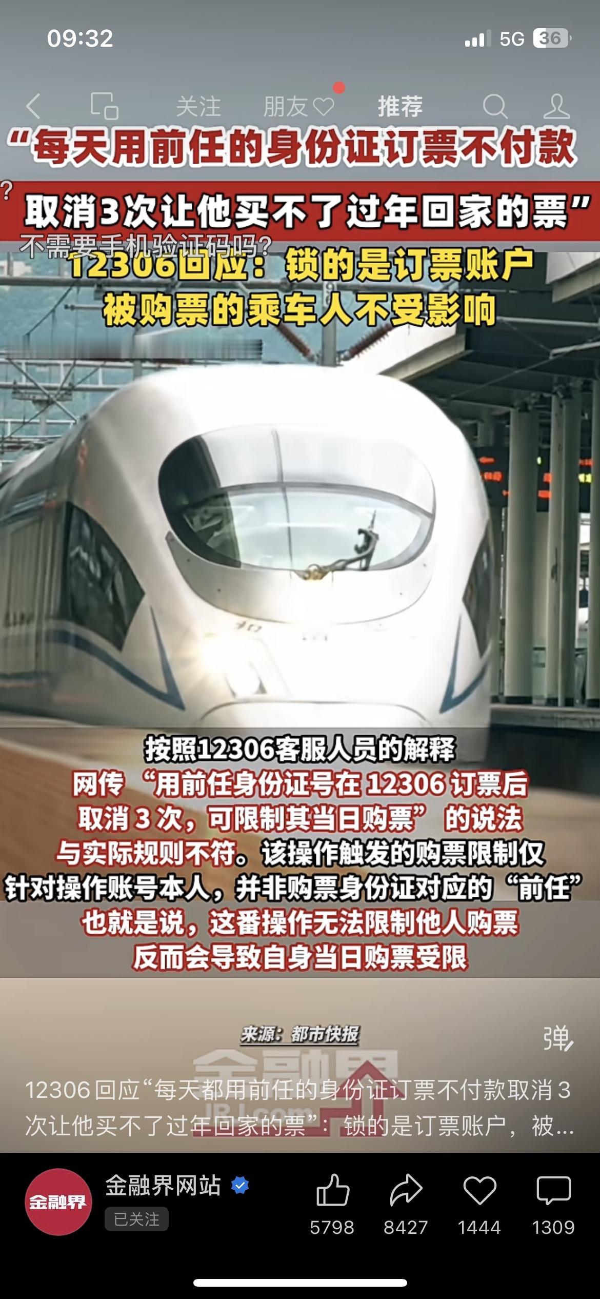用前任身份证订票锁他?12306打脸了! 网传“用前任身份证订票取消3次,让他买不了票”,12306回应:锁的是你的购票账户,和被购票的人半毛钱关系都没有!别瞎折腾,最后自己买不了票哭都来不及! 你身边有人试过这种损人不利己的操作吗? 12306辟谣 民生热点