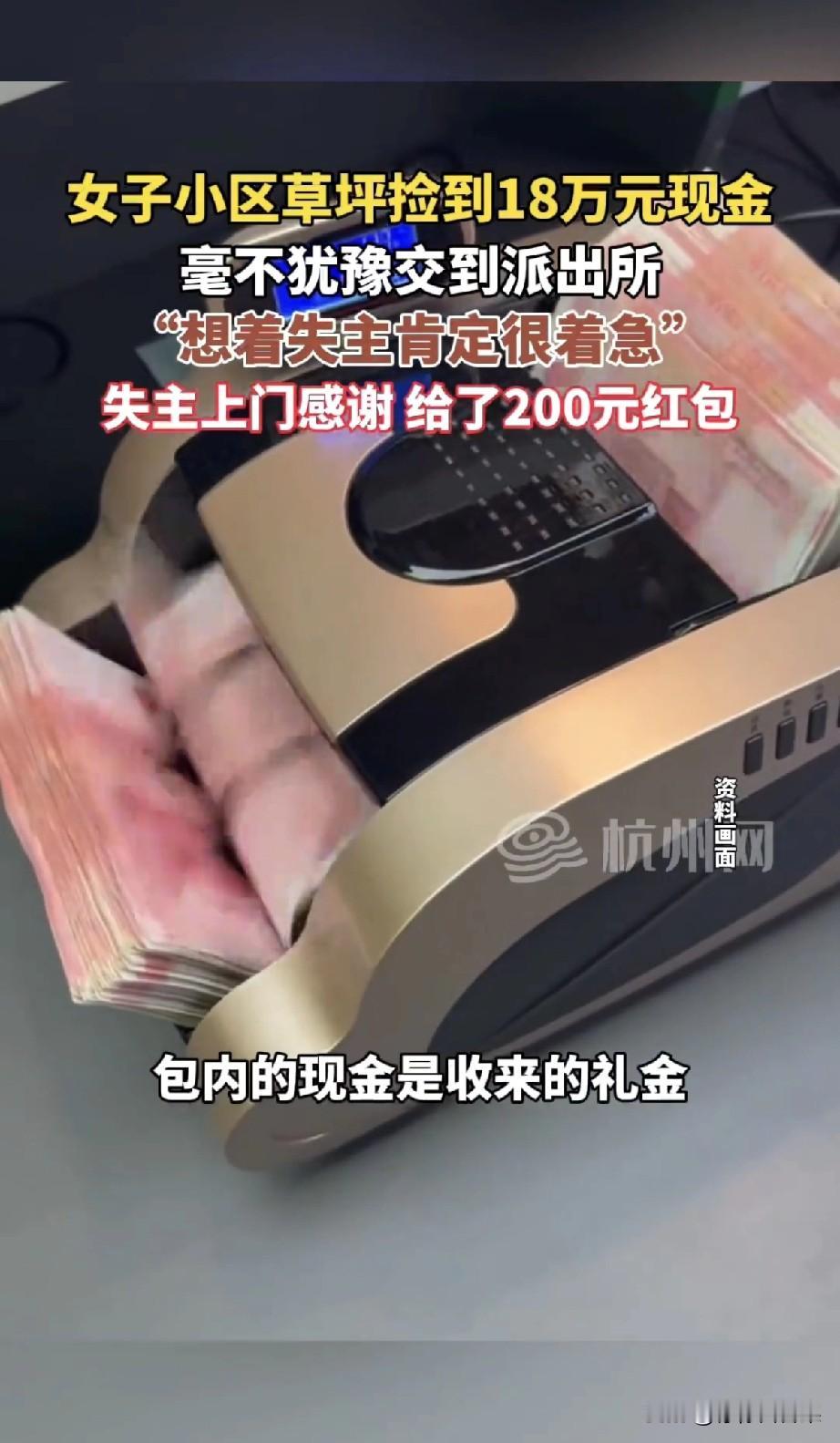 在浙江温州的一个普通小区里,发生了一件温暖人心的事情。 一位大姐在散步时,意外捡到了一个沉甸甸的包。打开一看,里面竟是整整18万元现金。面对这笔足以让人动心的巨款,她的第一反应不是惊喜,而是焦急:“失主肯定急坏了!” 她没有丝毫犹豫,立刻将包送到了派出所。很快,民警联系上了失主——后来得知,失主和自己是一栋楼的邻居,前几天他家刚结婚,包内的现金是收来的礼金,失主妈妈准备把钱带回老家,把包放在楼下等车,结果上车时包忘了拿。 失主拿回救命钱后,特意给大姐送来了200元红包表示感谢。 这件事在网上传开后,评论区直接炸了锅: - 网友A:“大姐拾金不昧值得表扬,但这200块钱也太拿不出手了吧?18万的救命钱,怎么也得意思意思!” ​ - 网友B:“虽然说做好事不是为了钱,但这对比也太强烈了,看得人心里有点不是滋味。” ​ - 网友C:“大姐的善良是无价的,但失主的感谢能不能更真诚一点?” 当然也有不同的声音: - 网友D:“心意到了就行,多少都是个感谢,别道德绑架了。” ​ - 网友E:“大姐图的不是钱,是心安。我们更该关注她的善良,而不是纠结红包的大小。” 其实,这件事最动人的地方,不在于红包的厚薄,而在于大姐面对诱惑时的不动心。她用行动告诉我们,善良和诚信,才是这个时代最宝贵的财富。 你觉得200元的红包是心意到了,还是确实太少了?评论区聊聊你的看法!