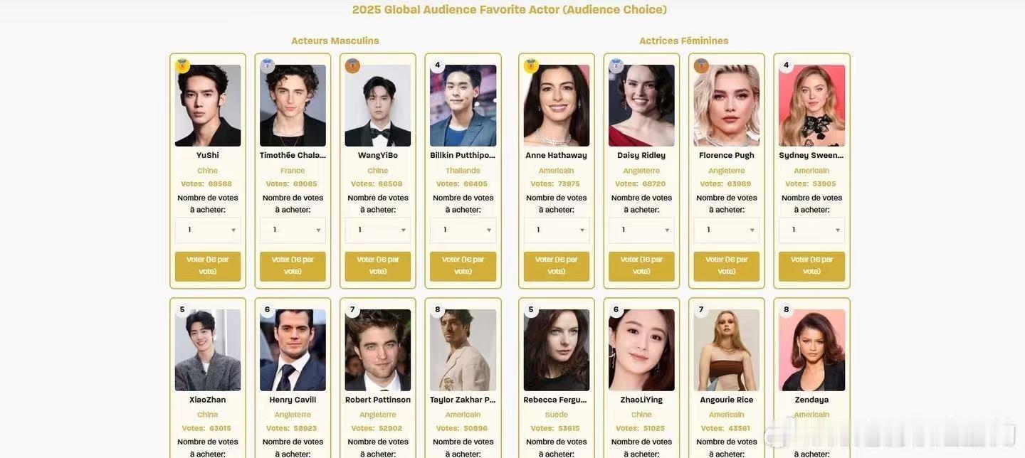 2025年欧洲世界电影节新增“全球观众最喜爱演员(观众选择奖)”,该奖项对标国内百花奖,由全球观众票选产生,国际投票排全球女明星赵丽颖第6,国内第一,赵丽颖还是太火了