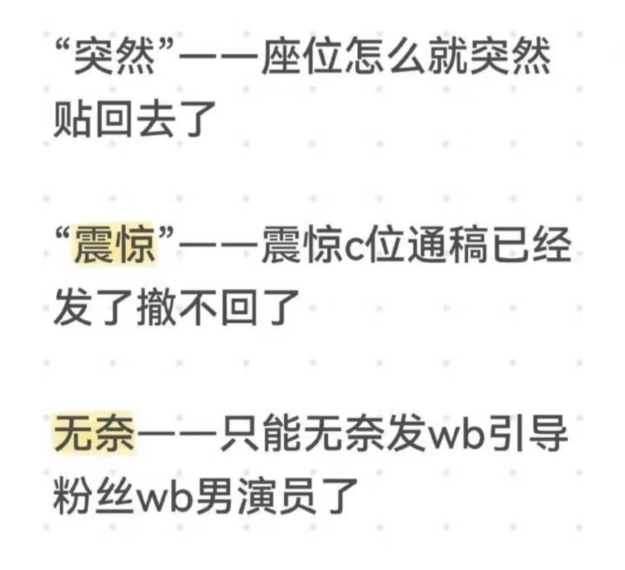 “突然”一一座位怎么就突然贴回去了“震惊”一一震惊c位通稿已经发了撤不回了无奈一一只能无奈发wb引导粉丝wb男演员了