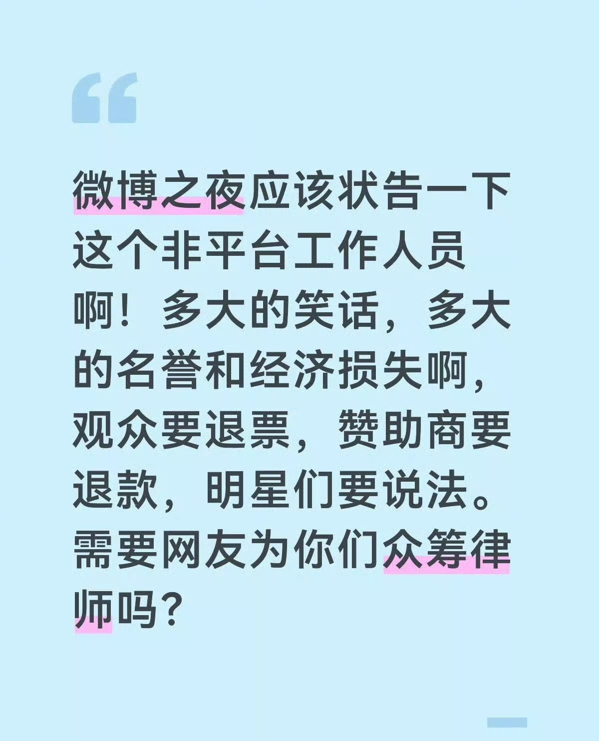 微博之夜应该状告一下,这个非平台工作人员啊!多大的笑话,多大的名誉和经济损失啊!观众要退票,赞助商要退款,明星们要说法。需要网友为你们众筹律师吗?