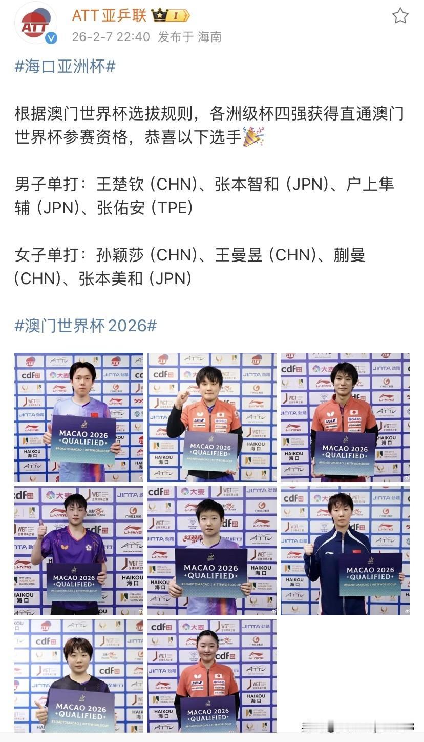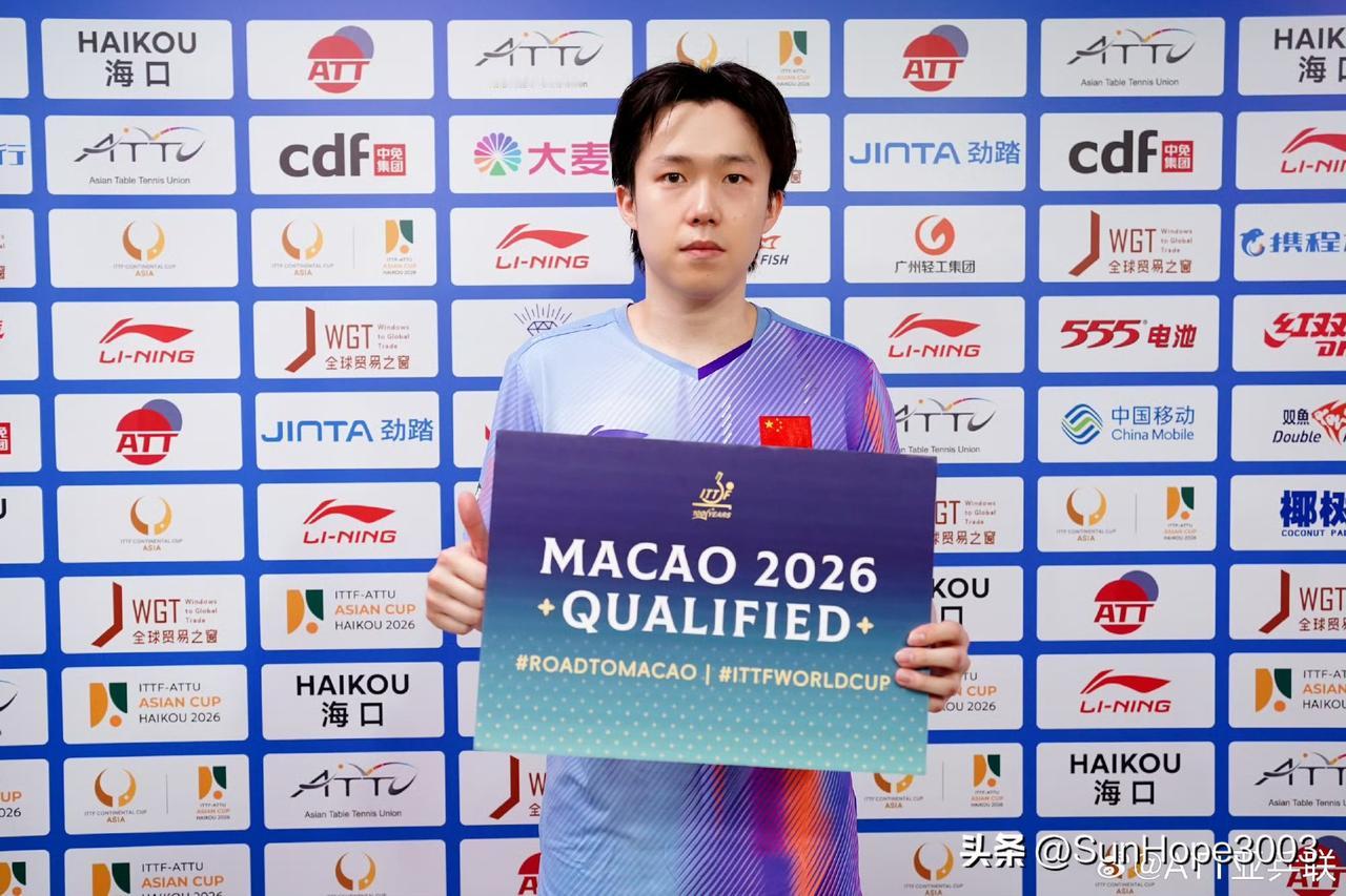 孙颖莎,王楚钦,王曼昱,蒯曼获得直通澳门世界杯的参赛资格。 亚洲杯四强直接获得世界杯资格,张佑安,户上也获得了资格, 林诗栋被户上淘汰了,没有进入四强,所以这一次没有。 但是王楚钦和孙颖莎凭借多哈世锦赛单打冠军,已经获得资格, 所以对于国家队来说,男女队名额又多了一个, 男队我们还有四个名额可以参加世界杯。