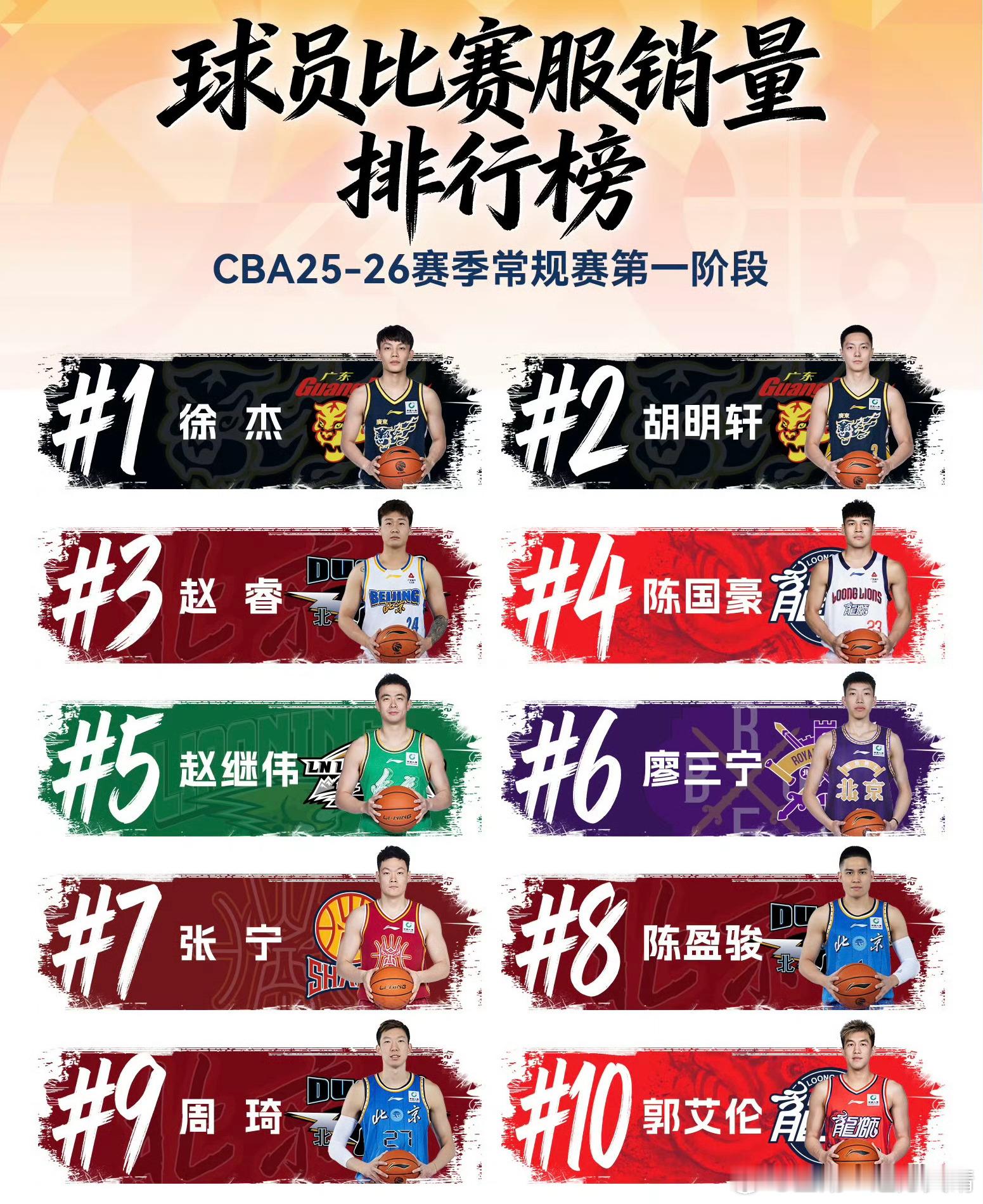 辽宁男篮CBA联赛 第一阶段球衣销量:赵继伟个人第5名,辽宁球队第3名。