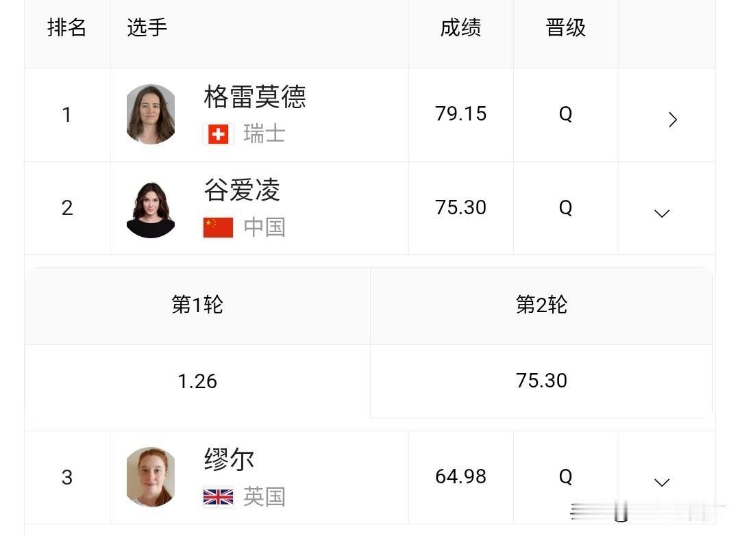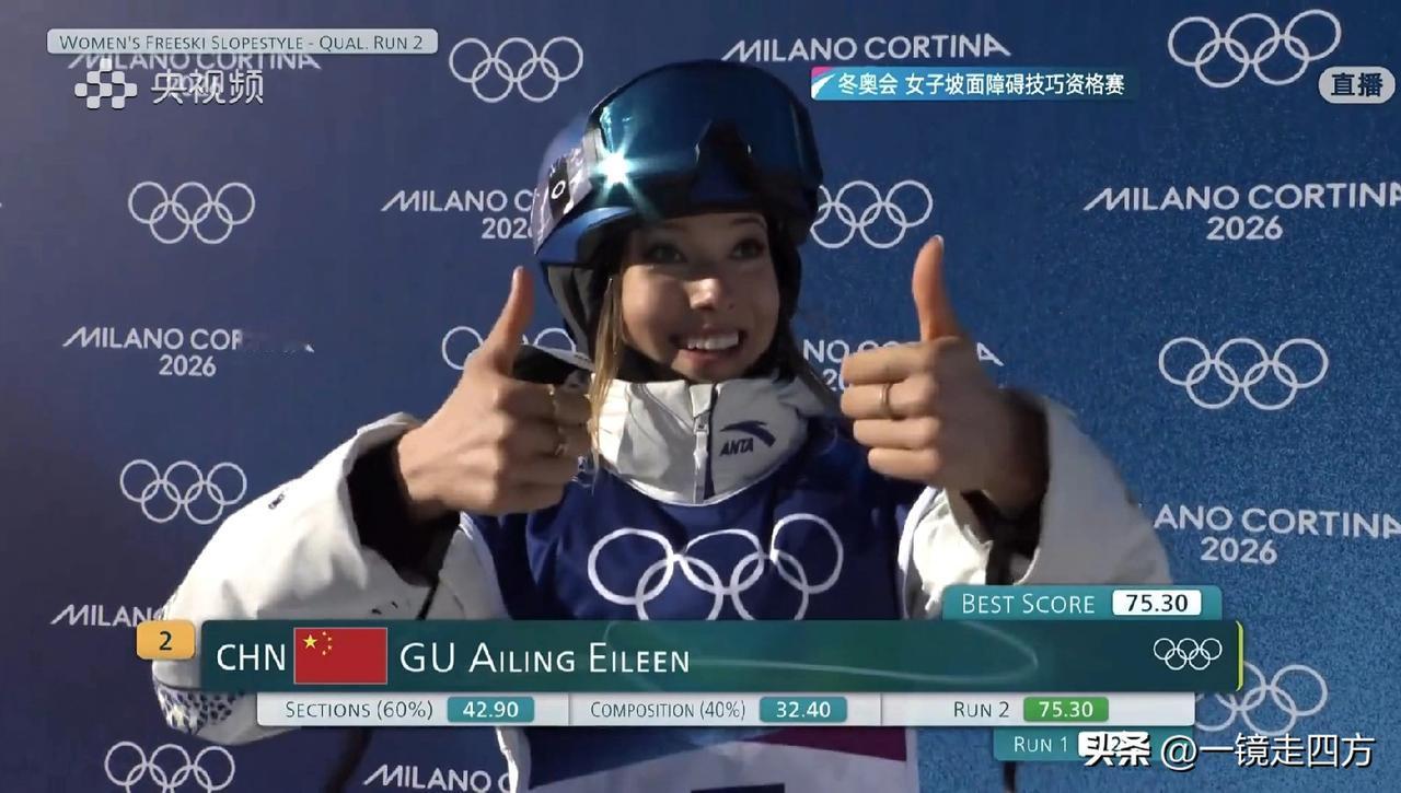 米兰冬奥会自由式滑雪女子坡面障碍技巧预赛开战,中国选手谷爱凌、刘梦婷、杨如意和韩林杉携手出战,这是北京冬奥会该项目银牌得主谷爱凌本届赛事的首秀。首轮她第二顺位出场,在道具区完成转体动作时重心失控摔倒,仅获得1.26分,好在没有受伤,在第二轮滑行中表现稳定,拿到75.30分,锁定决赛资格。