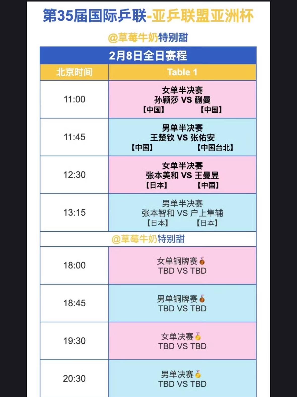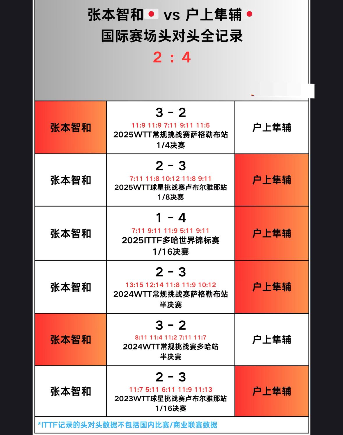 张本智和与户上隼辅的头对头全记录—海口亚洲杯男单半决赛对阵 张本智和VS户上隼辅! 2月8日,13:15, 海口亚洲杯男单半决赛, 张本智和VS户上, 从以往的交手记录来看, 张本对户上二胜四负, 处于劣势地位, 手心手背都是刺, 要不然明天让他俩一人一张红牌, 取消比赛资格吧! 林诗栋3:1户上,被翻盘太可惜, 户上隼辅明天拿出打小石头的劲, 打张本就好! 希望林诗栋好好总结经验, 绝地反弹, 新加坡大满贯加油吧!