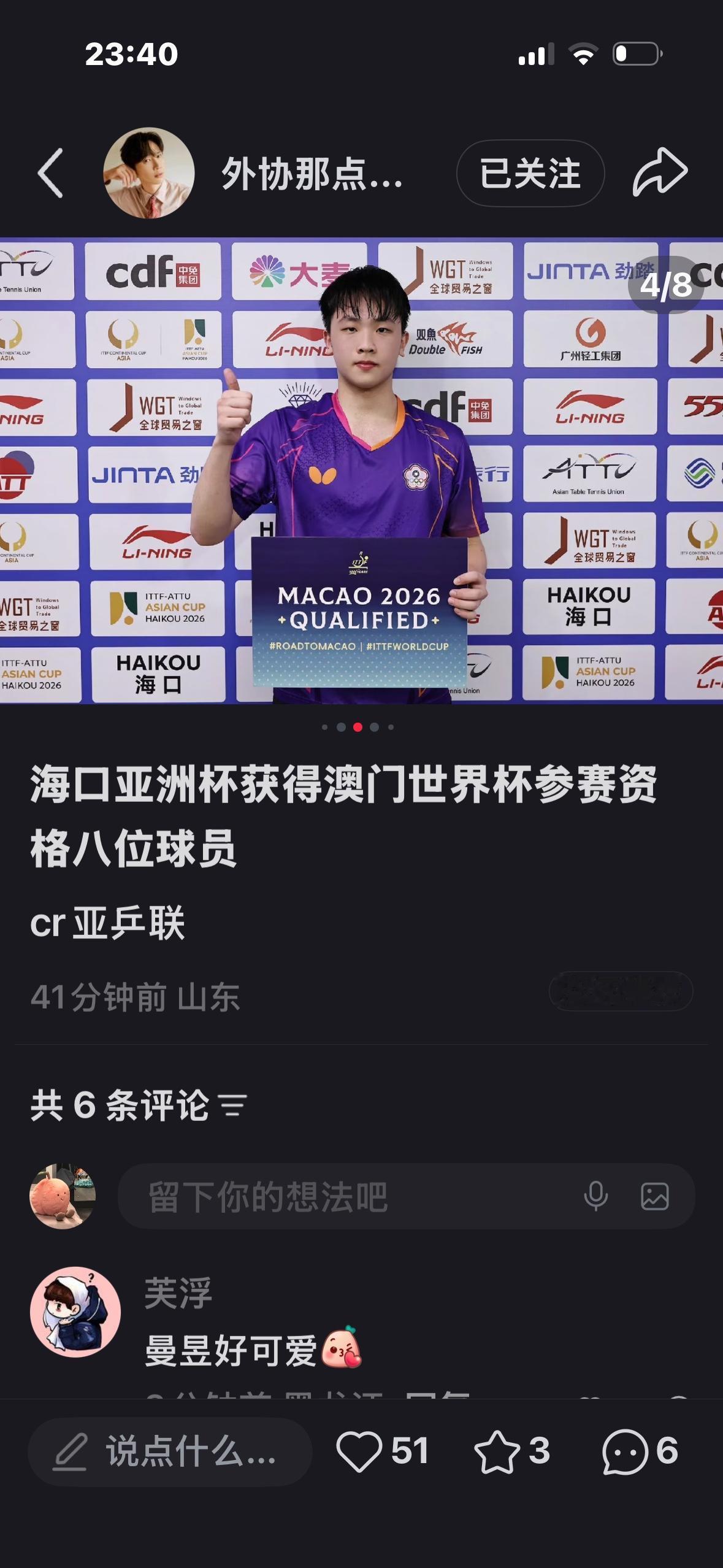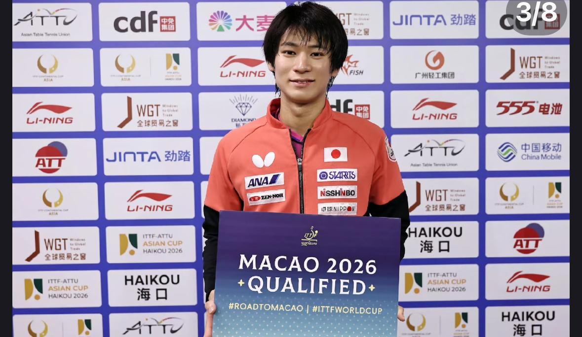 海口亚洲杯四强选手获得澳门世界杯参赛资格——孙颖莎 王楚钦 王曼昱 蒯曼加油 2月7日,亚乒联公布了海口亚洲杯 打进四强的8名球员获得 澳门世界杯的参赛资格! 王楚钦 张本智和 户上隼辅 张佑安, 孙颖莎 王曼昱 蒯曼, 张本美和! 张本智和兄妹都打进半决赛, 男线方面,国乒选手就剩王楚钦, 王楚钦伤愈归来更稳了, 心态平和,对比赛的胜负欲 也更从容,这样才能发挥出自己的优势和最好的状态! 莎莎 曼昱 蒯曼的照片最可爱, 明天半决赛, 继续加油!