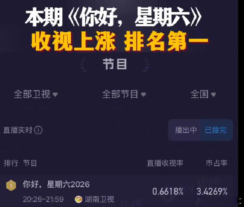你好星期六收视率第一你好星期六 实时收视0.6618,峰值破0.7077,省级卫