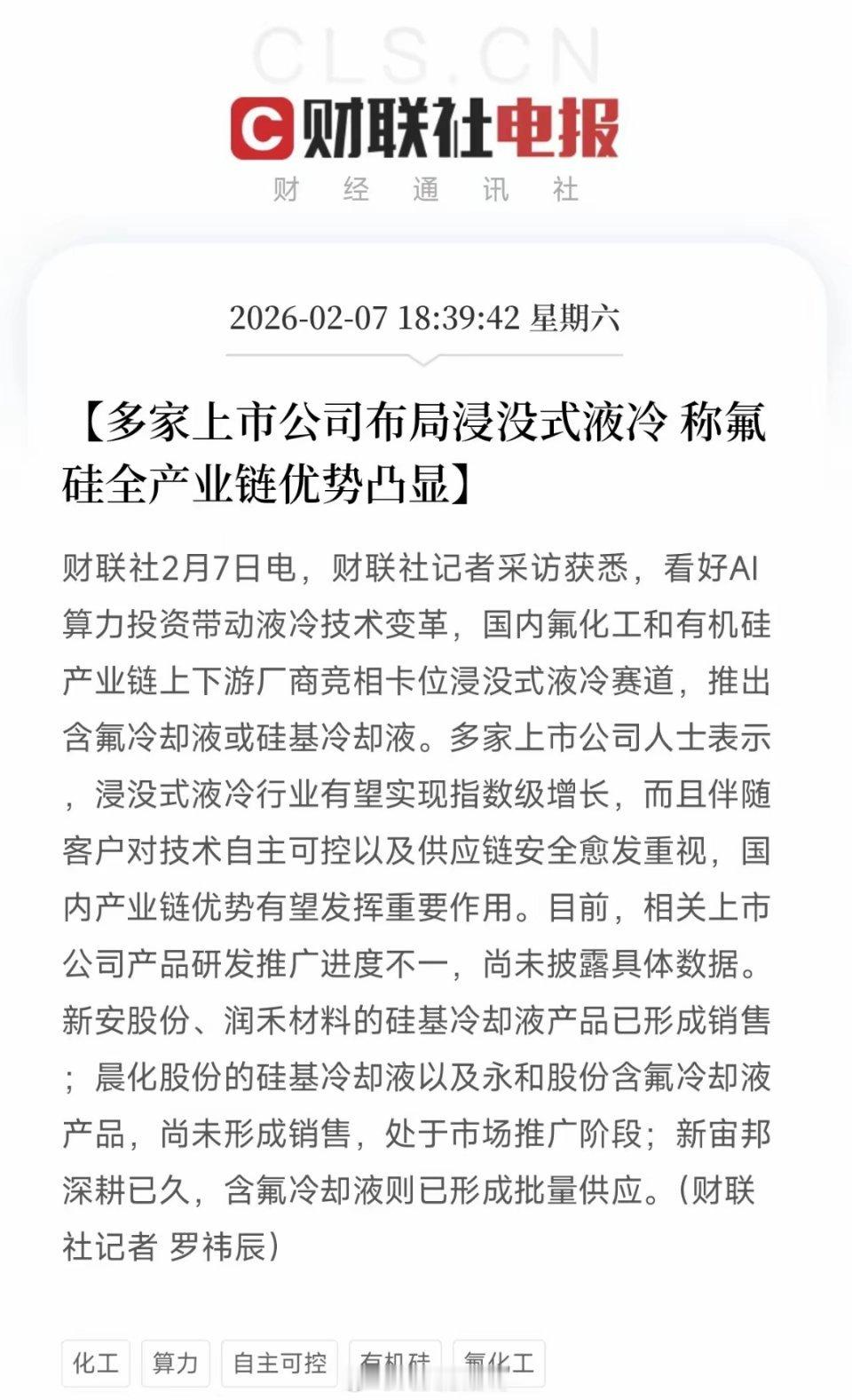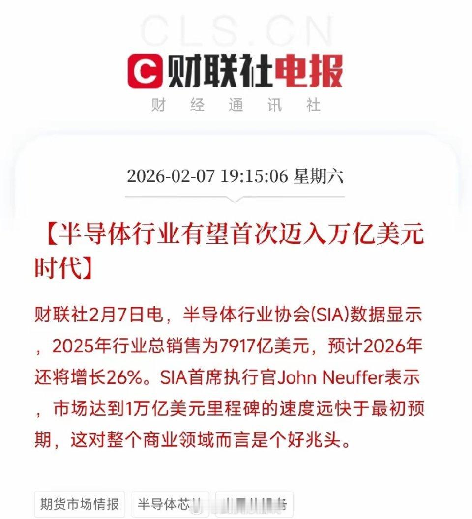 下周重点关注三个方向!为什么?1. 半导体!半导体!半导体!2. 液冷技术!液冷技术!液冷技术!3. 商业航天!商业航天!商业航天!核心逻辑和数据支撑:1. 半导体:行业首次冲击万亿美元规模,增长确定性极高· 市场里程碑:半导体行业协会(SIA)数据显示,2025年全球行业销售额,已经达7917亿美元,预计2026年将,同比增长26%,首次迈入万亿美元时代。SIA首席执行官称,“速度远快于预期”,印证全球数字化和AI需求爆发。· 驱动因素:AI算力、汽车电子、物联网等,需求持续扩张,高端芯片供需紧张,行业已进入高速增长通道。2. 液冷技术:AI算力升级。引发散热改革,产业链公司竞相卡位· 技术变革:随着AI服务器功耗飙升,传统风冷已逼近极限,浸没式液冷,成为必然选择。国内氟化工、有机硅产业链企业正全力切入该赛道。· 产业进度: ✅ 新宙邦(含氟冷却液)已实现批量供应; ✅ 新安股份、润禾材料(硅基冷却液)已形成销售; ✅ 晨化股份、永和股份等,处于市场推广阶段。· 增长潜力:行业人士预测,浸没式液冷市场,有望实现指数级增长,且供应链自主可控,凸显国内企业优势。3. 商业航天:可重复使用技术突破,商业化进程加速· 事件催化:2月7日,我国在酒泉卫星发射中心,成功发射可重复使用试验航天器,将开展关键技术验证。此举标志着,我国在低成本航天领域取得重要进展。· 产业意义:可重复使用技术,是降低航天发射成本的核心,为卫星互联网、太空实验等,商业化应用铺平道路。战略持续支持商业航天发展,产业链机会逐步显现。科技主线共振,自主可控贯穿始终半导体(基础硬件)→ 液冷(配套技术)→ 商业航天(应用场景),三者共同构成“高端制造+自主可控”的核心链条。行业数据、技术突破和事件催化,形成三重驱动,下周关注度有望持续升温!