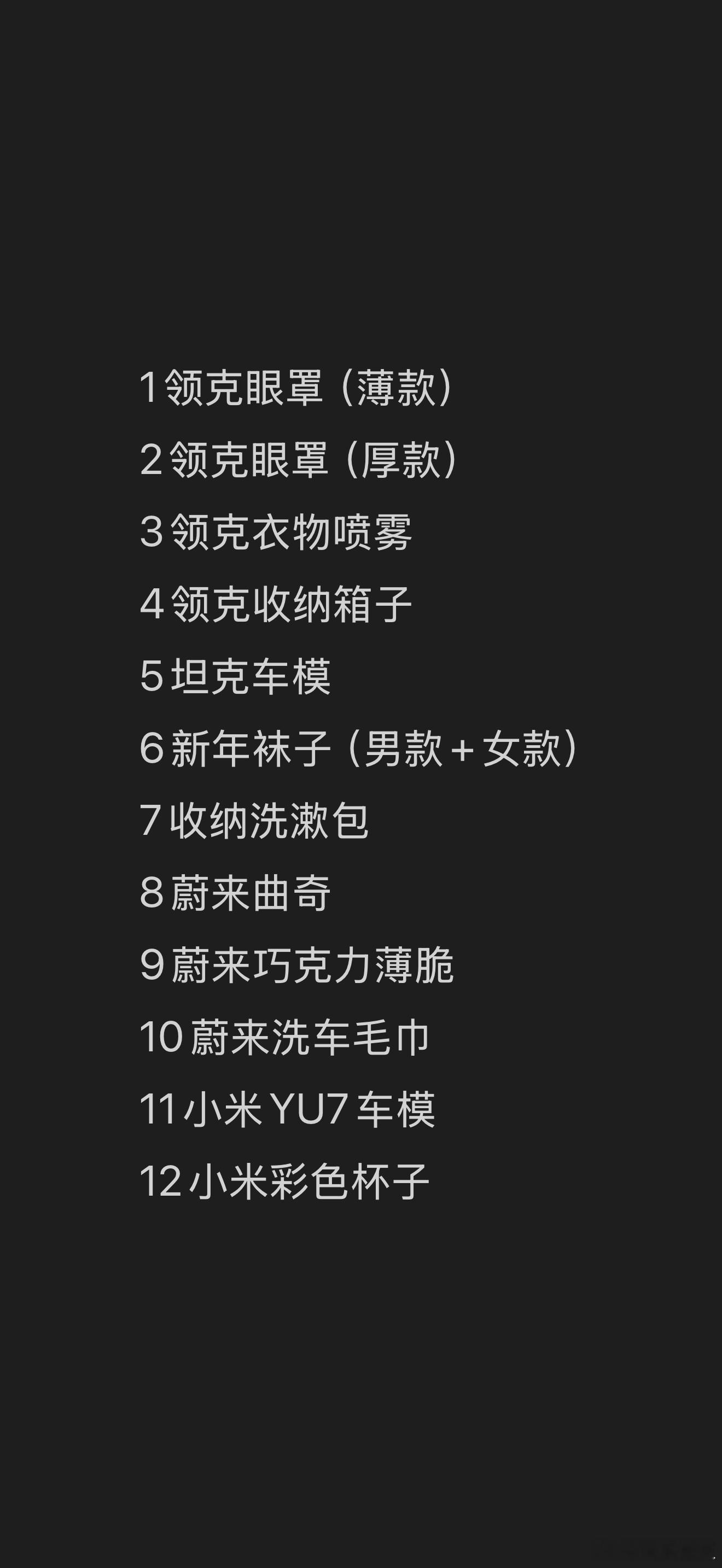 嘻嘻~熬夜中!!但是在给你们挑新年礼物🎁这么多礼品,都是送给一个人的!!今年的【交换礼物】我们先整 10个幸运宝宝全平台抽~以下的礼物🎁刚才我全都买好了👇👇👇什么时候抽?就等这些官方汽车app给我发完货,我拍完视频就抽!!!