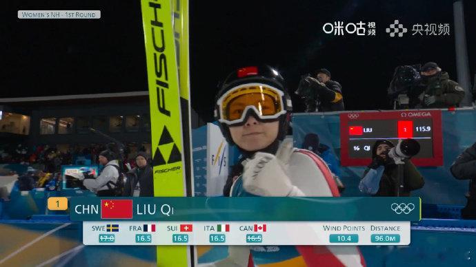 跳台滑雪女子标准台第一轮,🇨🇳刘奇顺利完成第一轮跳跃,比分:115.9