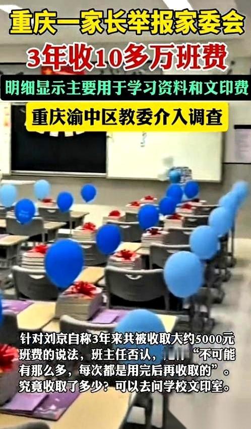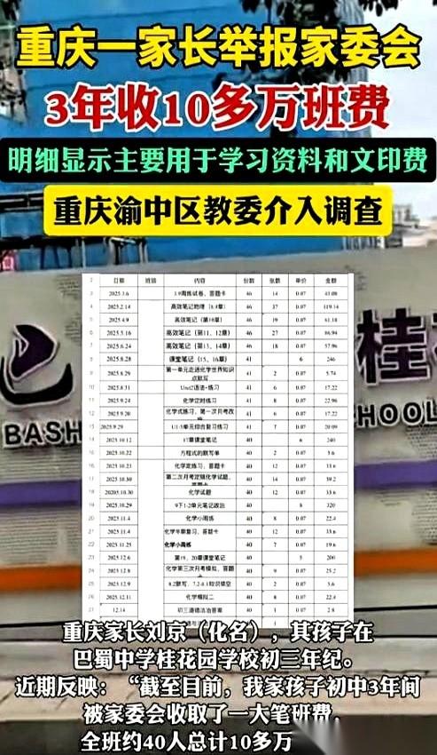 重庆一位初三家长,把自己孩子班上的家委会给举报了。 就因为班费。一年,她交了整整2000块。 钱一笔笔转过去,心里的石头却一块块垒起来,最后实在扛不住了。 事情是从家长群里开始的。通知弹出来,很突然:“各位家长,请交班费500元。” 没有商量,没有征求意见。紧接着,群里叮叮当当,一条条“已交”的消息刷了上来。她默默看着,手机屏幕的光映着她的脸,一言不发。 她家条件不好,这500块,是好几天的菜钱。但孩子在班上,她不敢不交,怕孩子被另眼相看。 可这只是个开始。 过段时间,钱用完了,新的通知又来了,还是500。又过段时间,又是500。一年下来,不多不少,四次,正好2000。 家委会把账目公示在群里,一笔笔很清楚:化学资料《启航》,英语资料《高分突破》,还有厚厚的复习卷打印费。每一分钱,似乎都花在了刀刃上,花在了孩子的前途上。 没人有异议,只有转账截图和“收到老师”的整齐回复。 她去找了班主任。班主任两手一摊,说这事全程是家委会操办,钱她一分没碰过,具体收了多少,她也不清楚,原则就是“自愿”。 “自愿”这两个字,像一根针,扎得她半天没说出话。 群里四十多号人,谁敢不“自愿”?当第一个家长发了“已交”的截图,这场“自愿”就已经变成了无声的命令。 最后,她按下了举报键。 这事儿说白了,就是把“自愿”两个字,玩成了一场心照不宣的绑架。 为了孩子好,到底有没有一条花钱的底线?还是说,只要进了那个群,你就得出钱遵守那个不成文的规矩?