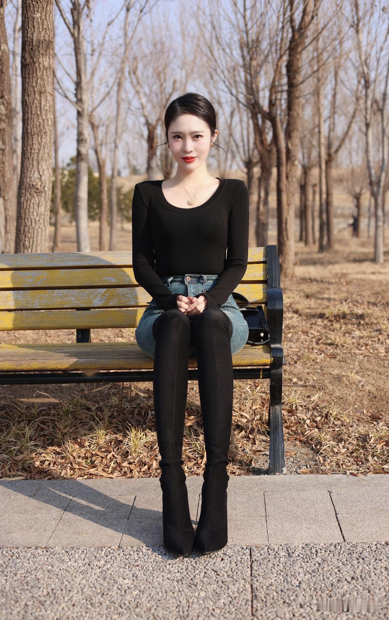 冬日暖阳下,黑衣红唇的少女静坐长椅,享受宁静时光。