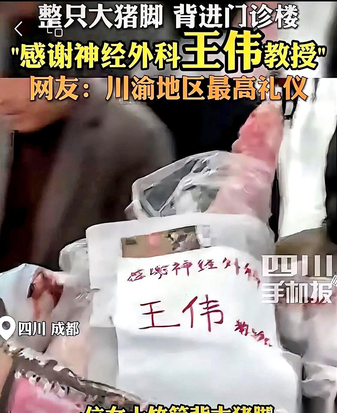 四川华西医院,门诊大厅里消毒水味混着人声,一排排的人低头刷着手机。 突然,一个女人背着个大竹筐挤了进来。 整个大厅的嘈杂,好像瞬间被按了暂停。排队的人不聊了,导诊台的护士抬起了头,连保安都下意识地朝这边挪了两步。 所有人的目光,全钉在了那个竹筐上——里面,一个油光锃亮的大猪蹄,旁边,还配着一满桶土鸡蛋。 女人不管这些,径直往前走,背影特直,好像在执行什么重要任务。 竹筐随着她的脚步一晃一晃,压在猪蹄上的那张白纸也跟着跳。有人眼尖,看清了上面的字:“感谢神经外科王伟教授”。 这一下,空气里的疑问全变成了恍然大悟。 原来不是闹事,是送锦旗来了。只不过,这“锦旗”未免也太硬核了。 消息一下就传开了。有人说,这大姐是王教授的病人,刚出院,这是她能拿出来的、最实在的谢意。城里人稀罕的土鸡蛋,还有能给医生补身体的猪蹄。 可问题也来了。医院的规矩,白纸黑字写着呢。这东西,到底算“心意”,还是算“收礼”? 王教授要是接了,会不会违反规定?要是不接,当着这么多人的面,不是把大姐的一片心意直接摔地上了? 这猪蹄,一下把所有规矩都问住了。 你说,人情这东西,有时候真比手术刀还难拿捏。它不是冰冷的铁,而是带着温度的肉,让你想拒都下不去手。 这哪是送礼啊,这分明是拿最朴素的东西,给冰冷的墙壁,上了一堂最暖的课。