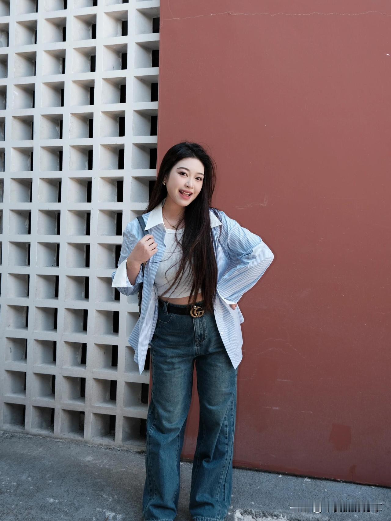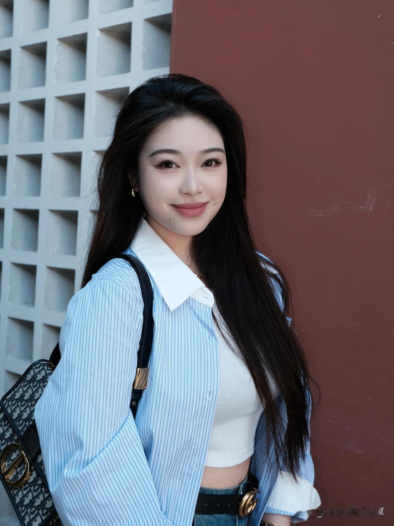 今天在户外随拍,发现高级感的温柔风穿搭太绝了。 在公园湖畔,看到一位元气甜妹,她