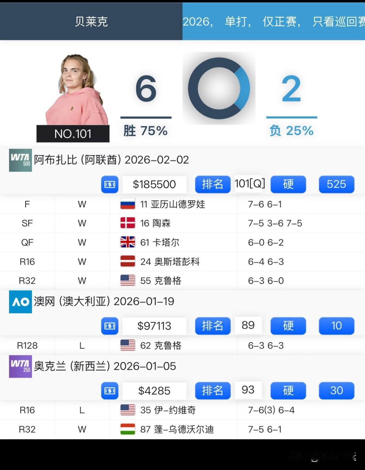 ✅拉杜卡努吞蛋不敌科斯蒂亚无缘夺冠[捂脸] ✅博尔特逆转战胜科帕奇夺得第四冠[呲牙] ✅贝莱克爆冷战胜压力娃首夺女单冠军🏆 WTA250俄斯特拉发站女单决赛,英国博尔特以2-1(5-7、6-2、6-1)逆转德国科帕奇继2024年诺丁汉站之后再度捧杯,这是她职业生涯的第四个巡回赛冠军。 WTA250罗马尼亚克鲁日·纳波卡站女单决赛,3号种子、罗马尼亚老将科斯蒂亚以2-0(6-0、6-2)送蛋横扫头号种子、前美网冠军英国拉杜卡努夺得冠军!这是科斯蒂亚职业生涯的第4个巡回赛冠军头衔! 拉杜卡努自2021年美网夺冠以来,冠军荒仍在持续! WTA500阿布扎比女单决赛,资格赛选手捷克贝杰莱克2-0(7-6(5)、6-1)爆冷战胜2号种子亚历山德洛娃职业生涯首夺500赛事冠军[赞][赞][赞]