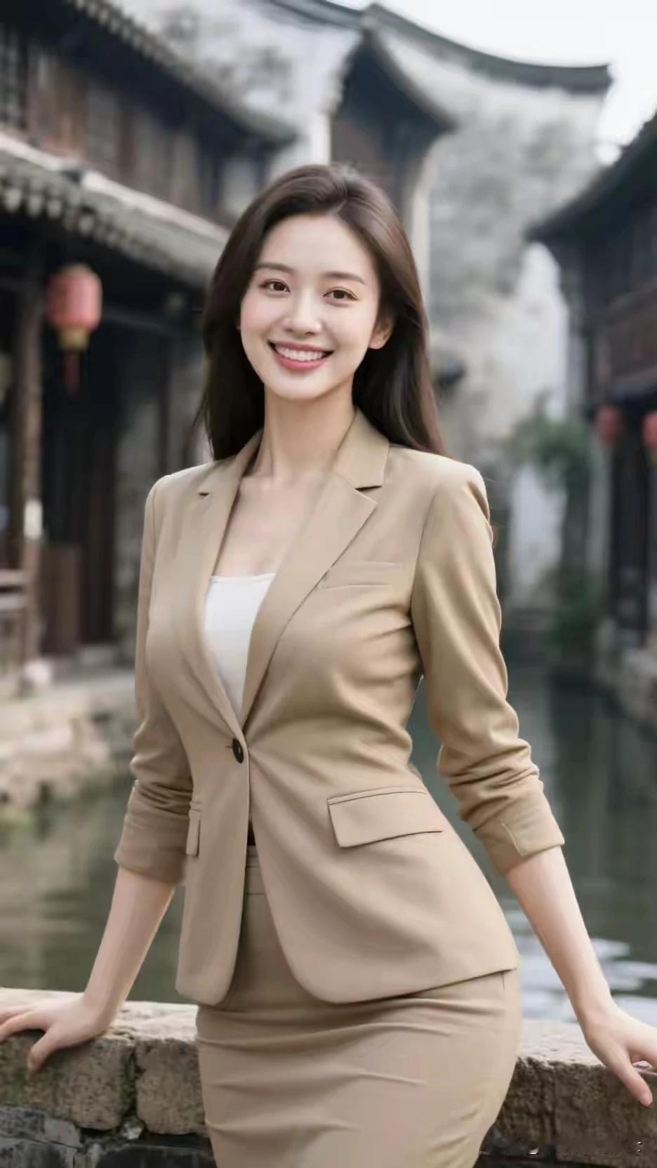 嫣然一笑百媚生, 西装女孩显娇容。 青丝如瀑随风舞, 容颜绝世韵倾城。