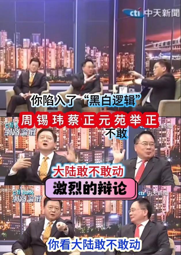 周锡玮、蔡正元、苑举正这三位时政评论专家同框,节目超级有看头。 俗话说三个女人一台戏,可他们三人围坐探讨时政,比女人的戏码更具看点。 在“大陆敢不敢动”这一话题上,蔡正元分析后给出的答案是“不敢”。 节目讨论中,三人观点出现分歧。视频节选片段里,主要是周锡玮和苑举正与蔡正元展开对驳。 周锡玮曾担任立法机构成员、台北县长等职。他理解大陆“忍耐”的应对策略,并给出自己的分析,认为中国是在等待时机、伺机而动。 苑举正是中国台湾地区学者,现任台湾大学哲学系教授。苑教授分析蔡正元的一系列说法,指出其可能陷入“黑白逻辑”的陷阱。 苑教授认为“战争是国之大事,死生之地”,世界并非非黑即白。选择战争是下下策,是不得已而为之。 评论区里,观众们也分享了观后感:蔡正元其实是恨铁不成钢,觉得该出手时不出手,该杀鸡儆猴时没动手,让一些国家得寸进尺。他们三位其实都是心系中国,只是观点和理念有所不同罢了。