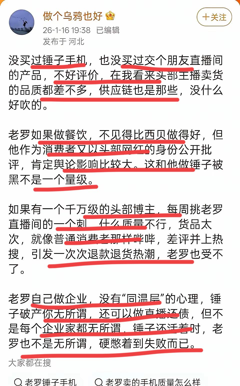这位大神是谁?看这不起眼但跟另类的网名,我估计没有多少人知道她是谁吧! 70后,80后,应该知道木子美这个名字,当年可是跟罗永浩,凤姐,芙蓉姐姐等一样红的初代网红~ 木子美在网络上消失很多年了,最近用这个小号复出!! 她谈了某贝预制菜和老罗之间的关系,说直播带货各家产品供应链都大差不差,没什么本质区别,她也没有在老罗直播间买东西,锤子手机也没买过~ 不过,她认为,让老罗做一个餐饮企业,未必能超过某贝,老罗是用自己超级大V的影响力,引发舆论风暴,跟锤子手机被黑,不是一个量级的! 如果有一个千万级大V,每天盯着老罗直播间挑刺,用放大镜找他的毛病,估计老罗也扛不住~ 木姐姐最后表示,老罗这个人没有同理心,你做锤子破产了,无所谓,还可以直播带货赚钱,可很多企业企业要了,要咋办呢? 你觉得老罗会反击木姐姐吗,但跟木子美吵架的,还没有人赢过! 你怎么看木子美怼罗永浩呢?