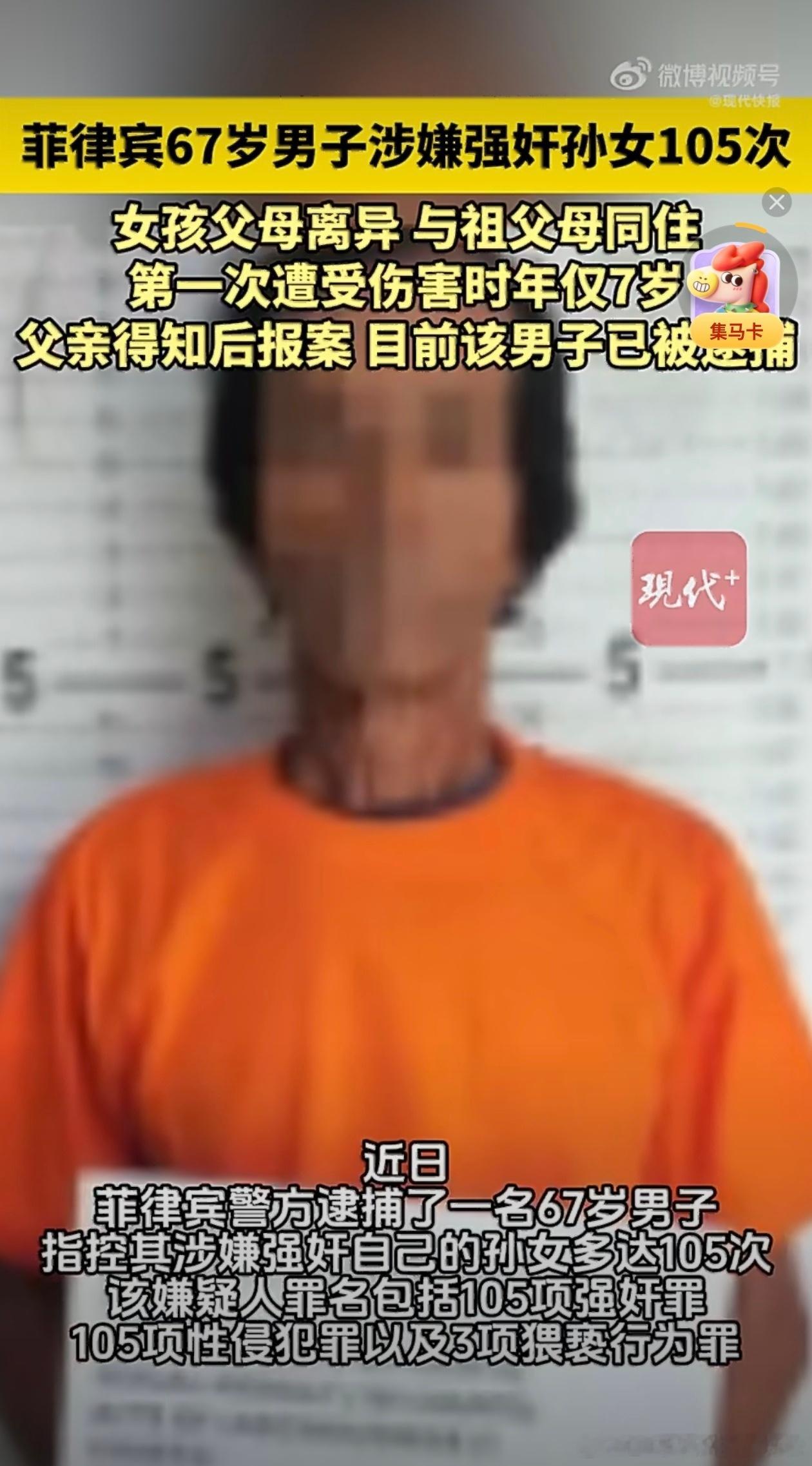 LH手机科技爱好者 一大早就让我刷到如此炸裂的新闻,内容我看了一遍又一遍确认没看错。自己的孙女都不放过,第一次受伤害后还只有7岁,这是人能干出来的事吗?太逆天了。菲律宾一男子强奸孙女多达105次