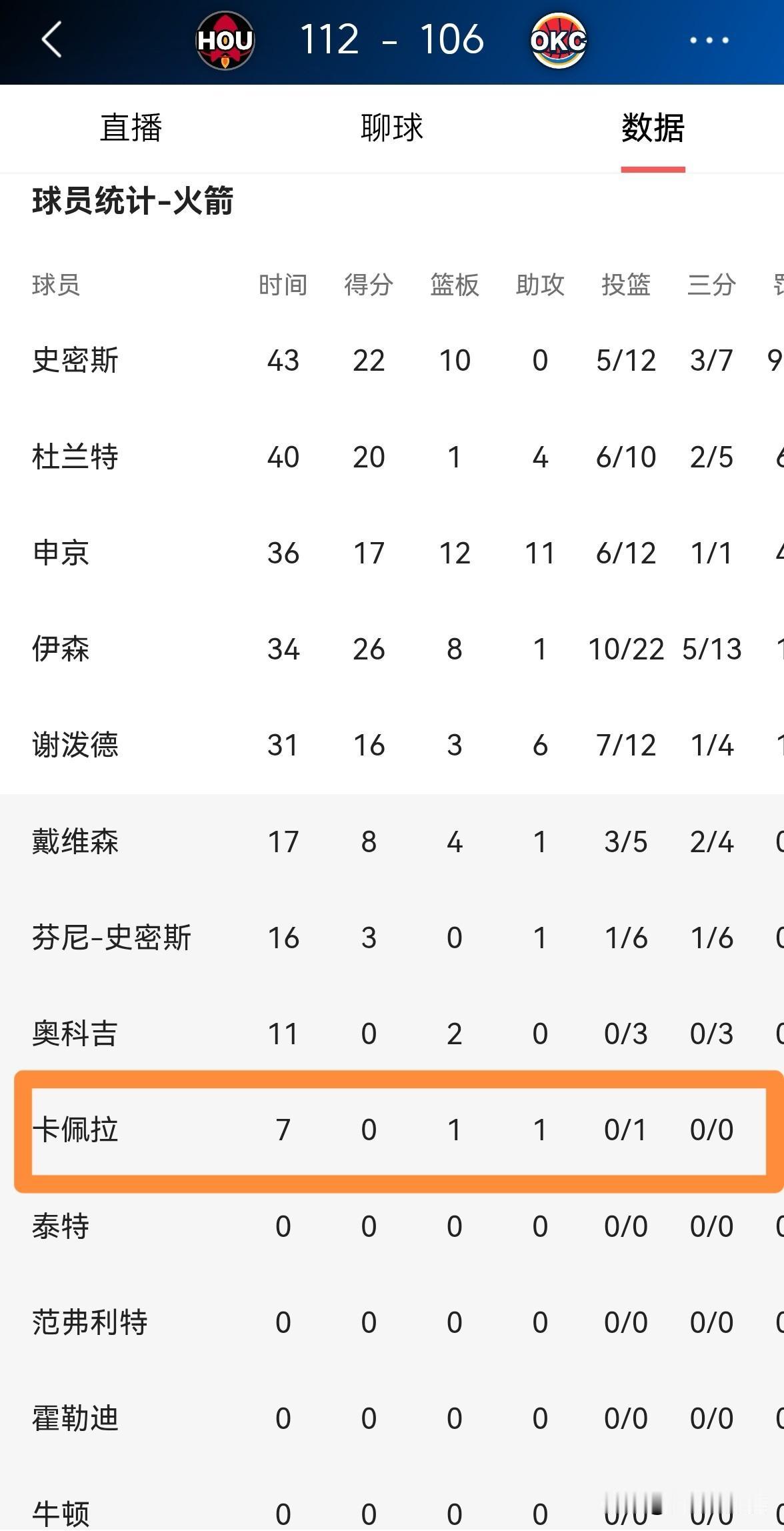 火箭主帅乌度卡对卡佩拉真是忍无可忍了!虽然今天火箭在客场以112:106击败雷霆,但是卡佩拉的表现却非常的糟糕,他仅仅替补出战7分钟后就惨遭主帅乌度卡的弃用。 整场比赛下来,卡佩拉替补出战7分钟,投篮1中0怒砍0分,还有1次失误,他的场上正负值为全队最低的-12。 事实证明,乌度卡教练弃用卡佩拉真是非常的明智,在卡佩拉被弃用之后,火箭在攻防两端都打出了非常出色的表现。