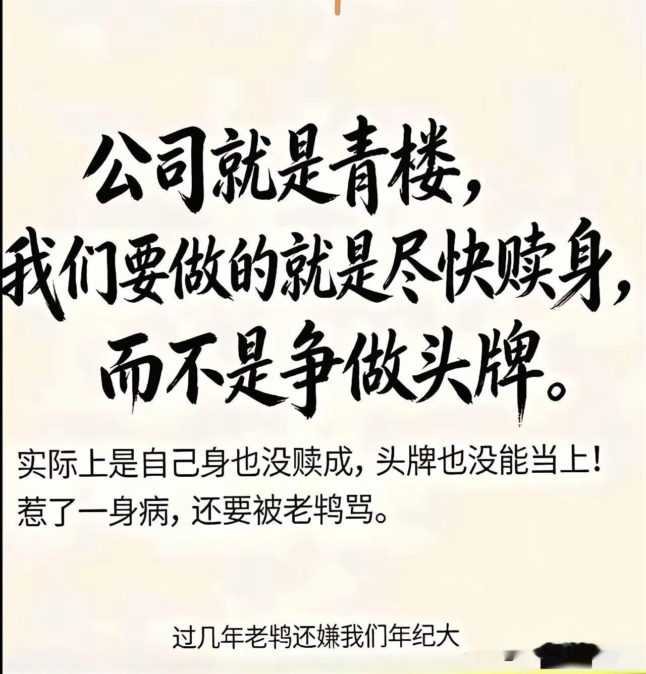 初看觉得扎心,细品才发现,这简直是把当代职场的残酷真相,用最辛辣的方式给说透了。 你以为在“搞事业”,其实只是在“卖青春”。 而这张图最最狠的地方,在于它点醒了我们:职场的终极目标,不是成为别人棋盘上的“最佳棋子”,而是要成为自己人生的“棋手”。 赎身钱是什么? 是你存下的足够应对失业风险的存款。 是你在工作之外偷偷打磨的、能直接变现的技能。 是你建立的、不依赖公司的个人品牌和人脉。 是你找到的、可以脱离雇佣关系的收入来源。 它不是让你躺平摸鱼,而是让你在努力工作的同时,永远给自己留一条后路。把一部分时间和精力投资在自己身上,而不是全部奉献给“老 鸨”。 毕竟,我们打工的目的,是为了有一天可以不打工。