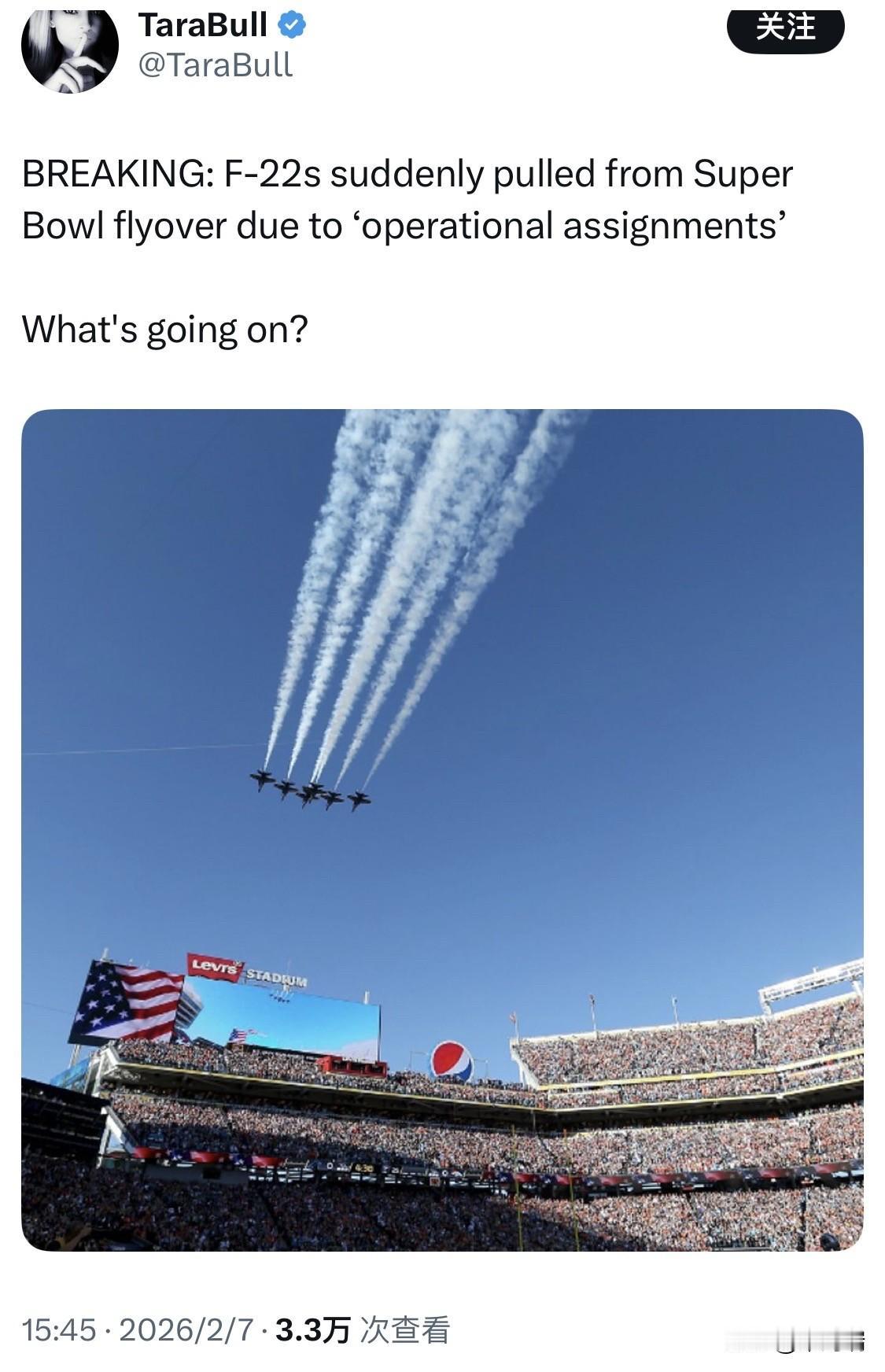 根据美国空军官方及相关军事媒体的最新消息,原定于 2026 年 2 月 8 日参加 第 60 届超级碗(Super Bowl LX) 飞行表演的 F-22 “猛禽”战斗机 确实已因“作战任务”被紧急撤下。 1. 取消原因:作战节奏加快 美国空军体育外联项目经理凯蒂·斯宾塞(Katie Spencer)在接受 Military Times 采访时确认,由于军事作战节奏(Operational Tempo)加快,原本计划展示两军(空军与海军)第五代战机的方案被迫调整,两架 F-22 战机已被调往执行具体的作战任务。虽然官方未透露具体的任务目标,但强调这种调整在军事部署中属于正常优先顺序。 2. 替代机型与最终编队 尽管 F-22 缺席,超级碗的飞行表演仍将作为美国建国 250 周年纪念活动的一部分如期举行,总计由 8 架飞机 组成的庞大编队将飞越列维斯体育场(Levi's Stadium): 空军部分:2 架 B-1B “枪骑兵” 战略轰炸机和 2 架 F-15C “鹰”式 战斗机(后者直接替换了 F-22 的位置)。 海军部分:2 架 F/A-18E “超级大黄蜂” 和 2 架 F-35C “闪电 II” 隐形战斗机。 3. 特殊背景 纪念徽章“留底”:由于取消任务发生在最后阶段,本次超级碗飞行的官方纪念臂章上依然保留着 F-22 的剪影,这成为了此次突发变动的实物印记。 非首次取消:此前 F-22 也曾因任务繁忙取消过类似巴黎航展等国际性表演任务。 近期任务参考:媒体分析指出,F-22 近期参与了包括针对叙利亚境内 ISIS 目标的“鹰眼出击行动”(Operation Hawkeye Strike)以及其他高强度区域威慑任务,这可能是导致机队资源紧张的原因之一。 第 60 届超级碗飞行表演概览 日期:2026 年 2 月 8 日 地点:加利福尼亚州圣克拉拉 列维斯体育场 看点:美军最大规模的跨军种联合编队飞行(虽然缺少了 F-22)