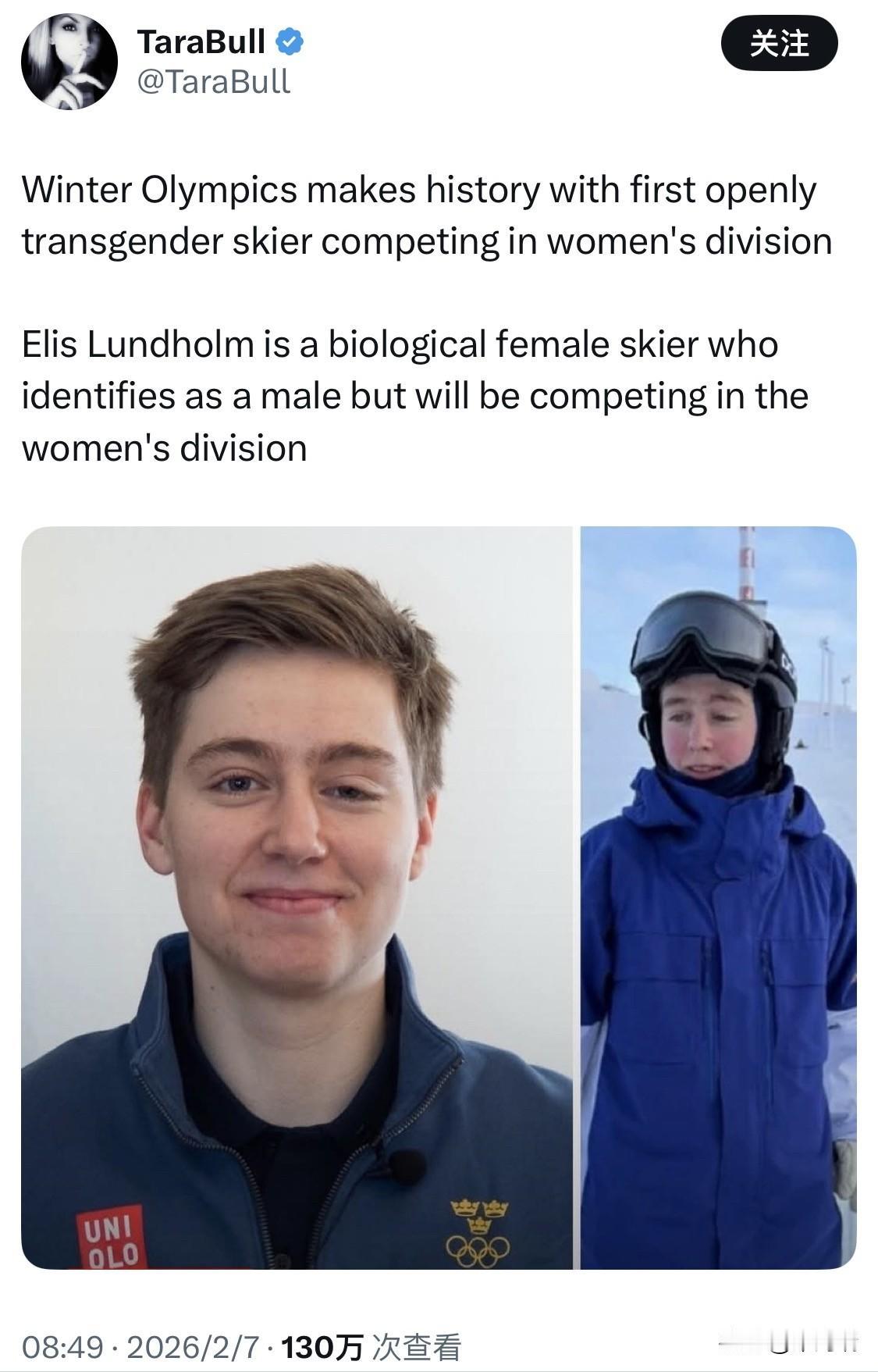 瑞典滑雪运动员埃利斯·伦德霍尔姆(Elis Lundholm)在 2026年米兰-科尔蒂纳丹佩佐冬奥会 上创造了历史,成为首位公开跨性别身份参加冬奥会的运动员。 现年23岁的伦德霍尔姆是一名跨性别男性(Trans man),即出生生理性别为女性,但其性别认同为男性。 参赛项目:他代表瑞典参加自由式滑雪中的女子雪上技巧(Women's Moguls)和女子双人雪上技巧项目。 参赛合规性:根据国际奥委会(IOC)现行的性别准则,由于伦德霍尔姆的出生生理性别为女性,且在该类别下获得了参赛资格,因此他获准参加女子组比赛。 赛事背景:伦德霍尔姆是本届冬奥会唯一一位公开身份的跨性别参赛者。尽管此前在夏季奥运会上已有跨性别运动员(如举重运动员劳雷尔·哈伯德)参赛的先例,但在冬奥会历史上,伦德霍尔姆是首位此类运动员。 伦德霍尔姆在接受采访时表示,他早已预料到可能会面临舆论关注甚至争议,但他选择专注于比赛本身,并表示在滑雪界一直受到良好的对待。
