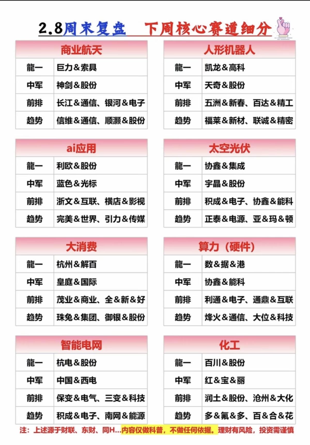 2.8周末复盘 下周市场热点方向! 1.商业航天 2.人形机器人 3.人工智能AI应用 4.太空光伏 5.智能电网 6.化工原料 7.算力,消费