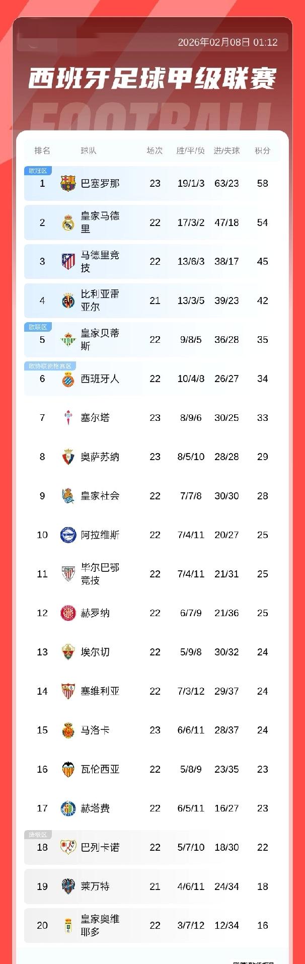 西甲积分榜:巴萨先赛积58分暂4分领跑!皇马将战瓦伦西亚 马竞将主场对阵贝蒂斯 02月08日 西甲第23轮 巴萨3-0拿下马洛卡 积分榜上,巴萨三连胜积58分以4分优势领跑,皇马将客战瓦伦西亚,马竞将主场对阵贝蒂斯