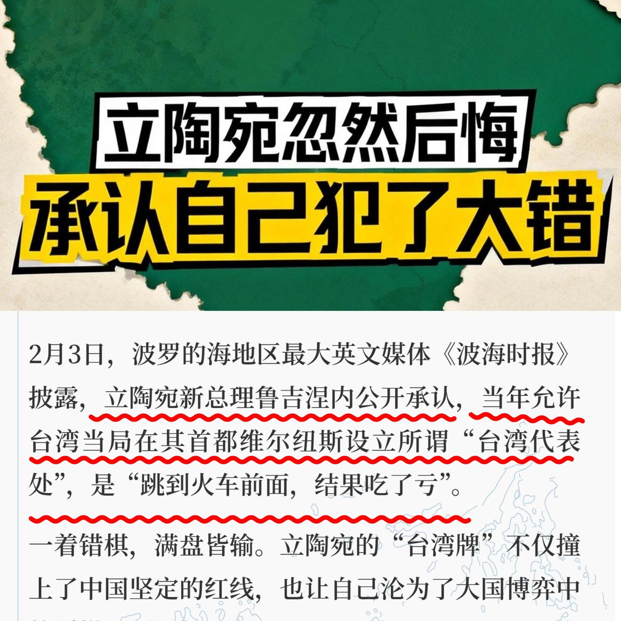 立陶宛这后悔有点晚了! 当年蹦跶得比谁都高,如今怂得比谁都快。新总理公开承认: 当初设所谓“台湾代表处”,是“跳到火车前面”! 说白了,就是螳臂当车,自己作死。 更打脸的是,他还补了一句: 台当局在其他的欧洲国家也开设了代表处,但别国都协调、低调办事,并选择“台北代表处”这个名称以后才开门营业的。而都与中国保持了经济合作关系! 结果只有立陶宛冲最前面,结果世界没感谢它,全在看笑话。 现在知道疼了? 晚了! 2021年挑衅一中原则,中国反制干脆利落:外交降级、经济脱钩、中欧班列绕道,立陶宛对华出口暴跌91.4%,产业遭重创。 在2024年到2025年, 立陶宛外交部竟然公然宣布将中国助理外交人员列为不受欢迎的人,并且拒绝中方人员入境! 咱们直接关闭了立陶宛的代办处, 把领事事务交给拉托维亚使馆代管了! 立陶宛就是想靠碰瓷中国,向欧美“表忠心”、换点好处。 结果美国当它是棋子,欧洲视它如小丑! 如今眼看德法英排队访华、谈合作,它彻底慌了,剧本不对啊,怎么只剩自己“反华”了? 我们明确回应了: 要改善关系,光嘴上忏悔没用,得实际行动! 要我说 先把那个破“代表处”撤了,老老实实道歉,再谈以后。 早干嘛去了?现在喊疼,不过是扛不住了而已。 这种国家,不给足教训,是真不长记性!
