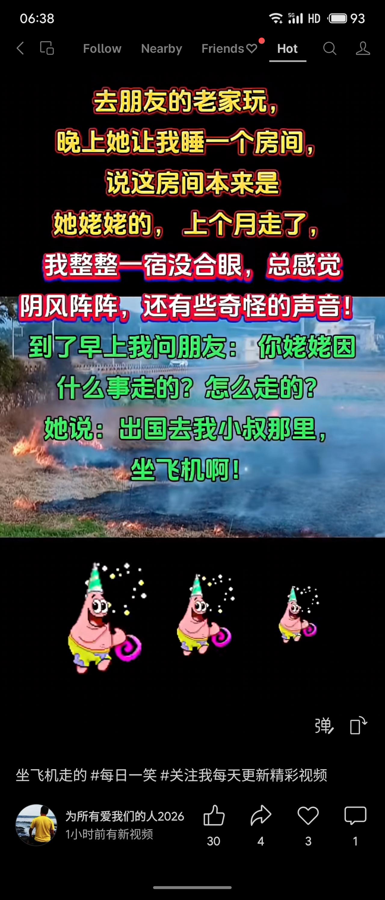 留宿朋友家,被安排住其姥姥房间,整夜害怕有怪声。晨间询问方知,朋友说的“走了”是指姥姥坐飞机出国,而非过世,虚惊一场。