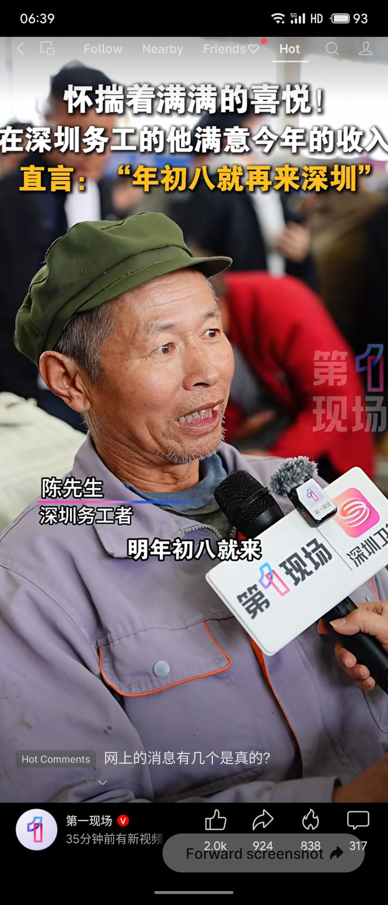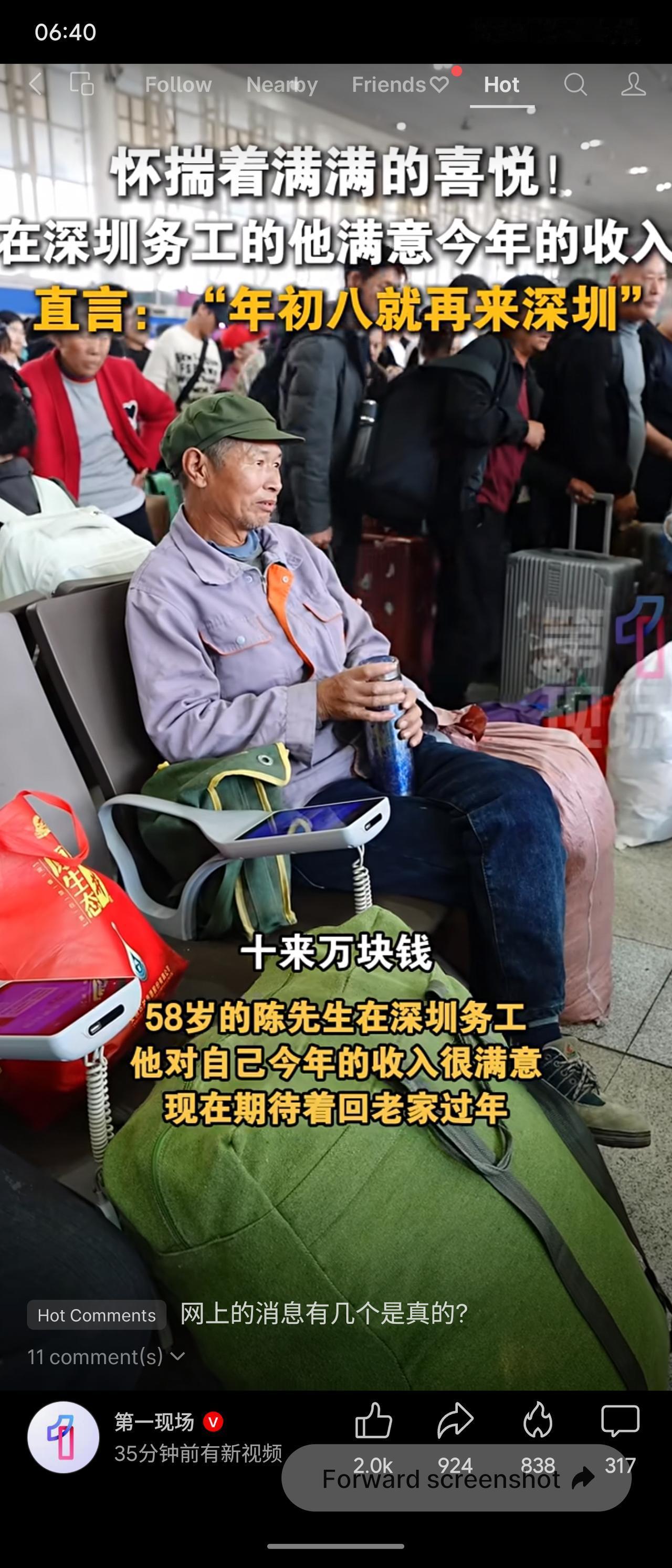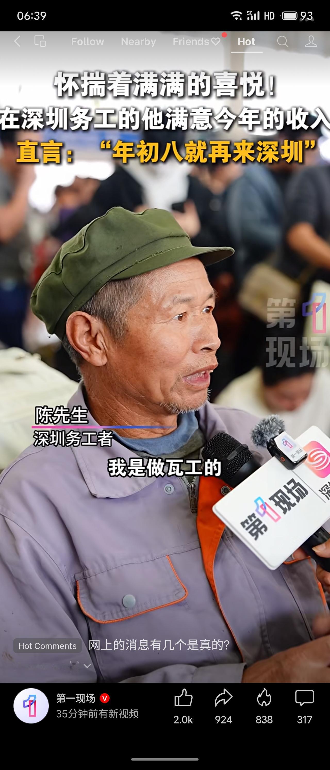58岁瓦工陈先生在深圳务工,年收入十余万且工资足额发放,他表示满意并计划年初八返深。该报道展现了劳动者获得感,但“热评第一”的质疑也反映了公众对信息真实性的审视。