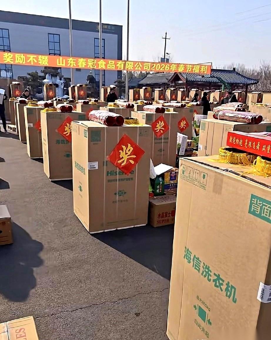 年底了,许多公司都在发年货。山东潍坊一家小厂火了,不是因为发了多贵的东西,而是因为年货太实在、太全乎,甚至有些员工直接叫来货拉拉往家拿,网友:这也太接地气了 这不是什么精算师做出的薪酬福利方案,这更像是一场针对物理定律的极限测试。 就在几天前,山东潍坊一个不知名的工厂门口,出现了一种反常的“交通拥堵”。甚至不需要走近,你就能听到后备箱锁扣发出的那声绝望的嘶鸣——“砰”的一声,车门刚被大力按下去,又顽强地弹了起来。 一台崭新的波轮洗衣机正卡在后备箱边缘,因为挤压,旁边的一袋面粉顺势滚落到了柏油马路上,腾起一阵白烟。 车主并没有恼火,反而在大笑。而在他身后,一排货拉拉司机正在排队候场。这大概是今年春节前最魔幻的一幕:员工领年货,领出了搬家的阵仗。 这不是在发纪念品,这是在发“家当”。 在这家只有40来人的食品厂里,年货的概念被彻底重构了。没有那种印着企业LOGO的廉价保温杯,也没有华而不实的电子礼品卡。这里堆着的是足以让任何一辆家用轿车避震器失效的“重武器”。 仔细数数,每个人的脚边码放着整整15到17样物资。这不是抽奖,是标配。 对于在这里干满一年的老员工来说,一台冰箱或者洗衣机只是“前菜”。紧随其后的是猪肉、花生油、大米、坚果,甚至还有在这个快节奏时代显得格格不入的——活蹦乱跳的大公鸡。 有人算了一笔账,这一堆东西的人均价值大约在3000元。 但在老板姜先生眼里,这个数字不能换算成人民币,而必须换算成“过年的尊严”。 这位和妻子都是农村出身的管理者,显然比写字楼里的HR更懂得乡土社会的运行法则。他太清楚,给3000块钱现金,在这个物价飞涨的年代意味着什么。 钱是无形的,它会迅速消融在房贷、孩子的补习班费或者某次不起眼的网购里,连个响声都听不见。 但一台搬回村里的洗衣机不一样。 它会实实在在地摆在客厅或院子里,在那里的每一天,都在向来串门的七大姑八大姨无声宣告:这家公司待遇硬得很。 姜先生把这种心理精准地定义为“被羡慕的情绪价值”。 在这场暴力的物资分发中,最有意思的插曲发生在一群年轻人身上。 这或许是某种代际冲突的具象化:当一只硕大的、羽毛鲜亮的活公鸡被塞过来时,几个刚入职不久的00后员工当场愣住了。 他们的生活经验里只有炸鸡块和真空包装的鸡胸肉,面对这种拥有尖锐喙部和惊人活力的原始食材,他们甚至不敢伸手去接。 这一幕被老员工拍下来传到网上,那一刻的尴尬与欢乐,比任何精心策划的企业宣传片都要真实。 除了活鸡带来的惊吓,这里的规则也粗暴得可爱。 没有什么复杂的KPI考核,也没有360度环评。门槛低到令人发指:入职满三个月,抱走一台大彩电。满一年,洗衣机或冰箱任选。 那个在现场打电话摇人的老师傅,对着手机喊的那句“让你开大车来你不听”,大概是这个冬天最凡尔赛的抱怨。 网上当然有不同的声音。有人敲着键盘说,发现金多好,想买什么买什么,何必发一堆重死人的东西。 这种观点看似理性,却忽略了这家小厂的“生态位”。 这是一家仅有40人的小微企业。在制造业招工难、留人难的今天,它没有大厂的光环,也没有上市公司的期权饼。 它拥有的,就是这种近乎家长式的包办逻辑:我不管你爱不爱逛超市,反正我把你过年要用的米面油肉全买了,连你走亲戚需要的面膜和化妆品都备好了。 这哪里是发年货,这分明是一套“过年生存解决方案”。 在这个原子化的社会里,我们习惯了冷冰冰的转账和红包。但当一家工厂愿意把年终奖变成需要动用货拉拉才能运走的麻烦时,这种“麻烦”本身,就构成了一种稀缺的温度。 对于那些把洗衣机塞进后备箱、还要担心车门关不上的潍坊工人来说,这种沉甸甸的坠手感,才是对辛苦一年最踏实的交代。