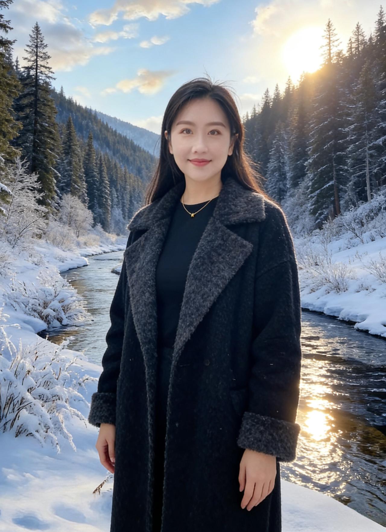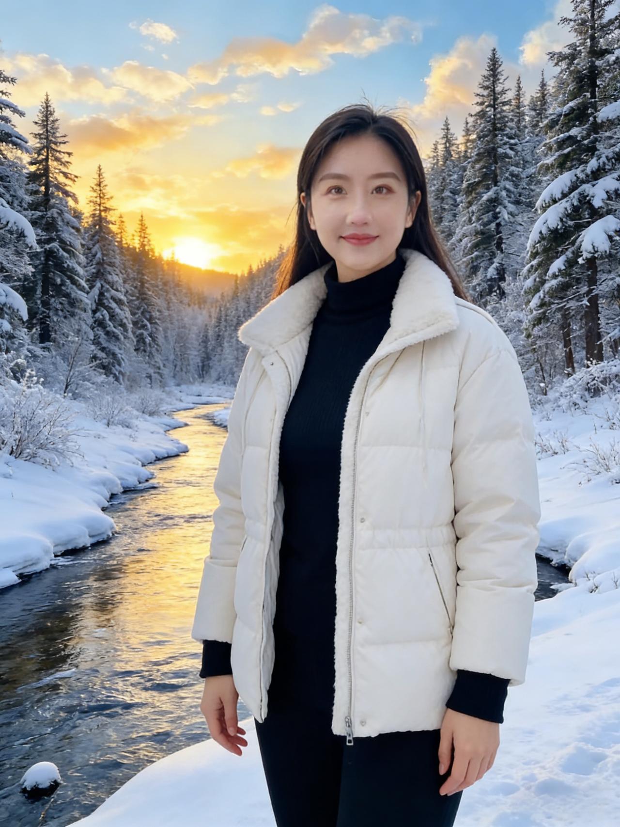白雪如银映晓天,嫣然一笑暖炊烟。 轻裘难掩芳华色,立尽冬风自婉然。