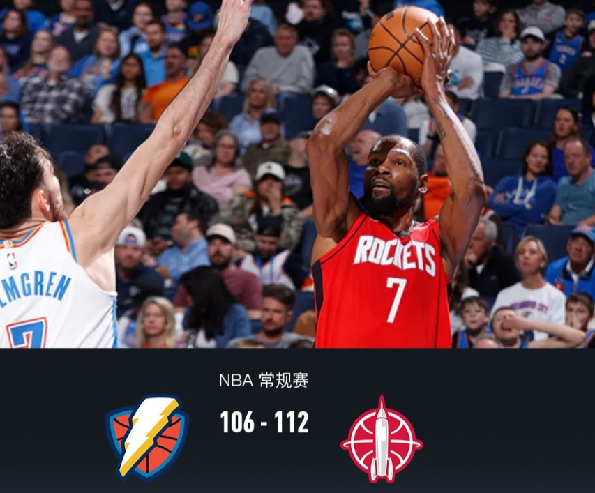 NBA 常规赛,俄克拉荷马雷霆对阵休斯顿火箭。首节双方战平,次节中段雷霆一度领先15分,随后火箭展开反扑,半场雷霆52-46火箭,第三节火箭轰出34-22反超比分,末节火箭顶住雷霆反扑,最终火箭112-106逆转雷霆。 俄克拉荷马雷霆卡森-华莱士23分4板4助,以赛亚-乔21分3板2助;休斯顿火箭伊森26分8板1助,小贾巴里-史密斯22分10板。 赛况 第一节,开场火箭谢泼德、伊森相继三分取得8-2领先,雷霆霍姆格伦、维金斯得分缩小分差,火箭谢泼德、伊森回应再度拉开分差,后半节短暂拉锯之后,火箭进攻断电,雷霆肯威、杰林威、以赛亚乔相继三分领衔攻势反超比分,好在火箭史密斯、谢泼德回应再度追平,首节结束,双方28平。 第二节,前半节火箭持续进攻哑火,雷霆霍姆格伦、以赛亚乔、华莱士联手一波21-6直接领先 15分,火箭戴维斯、申京相继打3分止血, 节末伊森、史密斯也站出来相继打3分成功缩小分差,半场战罢,雷霆52-46火箭。 第三节,上来火箭伊森、申京、谢泼德得分迅速追平,雷霆迅速一波9-2再度拉开分差,火箭伊森、谢泼德、杜兰特中远投止血,雷霆维金斯、华莱士保持回应依旧领先5分,但紧跟火箭伊森、戴维斯、史密斯相继三分反超比分,节末申京强杀内线造杀伤进步拉大分差,三节结束,火箭80-74雷霆。 第四节,开节火箭谢泼德、申京相继三分领先9分,随后雷霆华莱士连得7分掀起攻势节中段反超1分,火箭杜兰特三分反超回来,紧跟谢泼德、伊森得分再度拉开分差,雷霆卡鲁索三分止血,随后雷霆以赛亚乔连续罚球得分,火箭伊森、杜兰特及时回应保持领先,全场结束,火箭112-106雷霆。 球员全场数据 俄克拉荷马雷霆卡森-华莱士23分4板4助4断,以赛亚-乔21分3板2助3断,阿龙-威金斯17分2板1助; 休斯顿火箭伊森26分8板1助3断,小贾巴里-史密斯22分10板1断1帽,杜兰特20分1板4助1断1帽。 首发阵容 俄克拉荷马雷霆:卡森-华莱士,阿龙-威金斯,霍姆格伦,哈尔滕施泰因,多尔特; 休斯顿火箭:伊森,小贾巴里-史密斯,杜兰特,申京,里德-谢泼德。