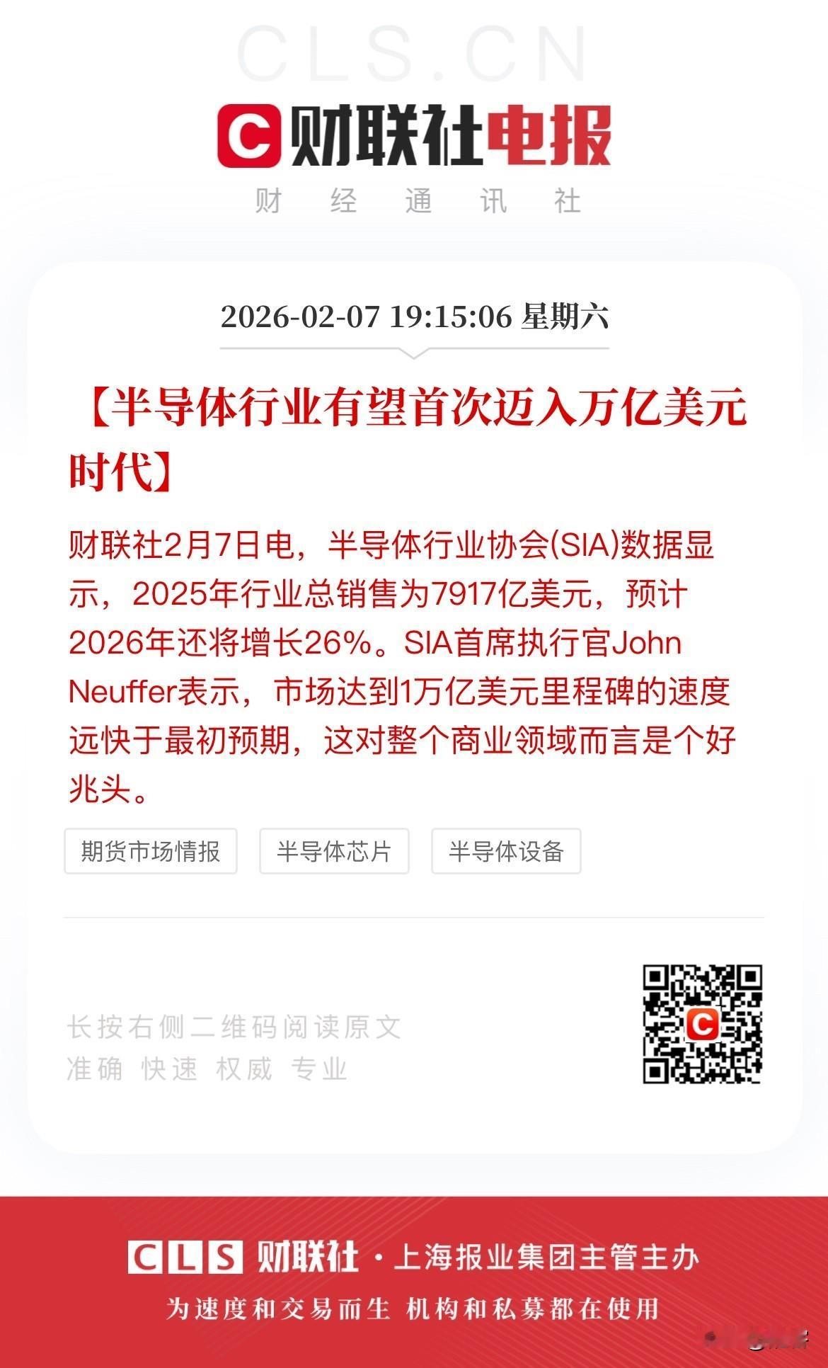 半导体行业协会万亿美元级重磅利好,但是冷静一点!因为行业繁荣意味着资本市场的退却和让位实体发展。 半导体行业题材在经历整个2025年的繁荣之后目前已经进入调整期,进入2026年明显感受得到半导体题材的降温。该板块变得需要用业绩说话的时候,不再是某个板块大热门就会产生无数妖股和无奈炒作题材和普涨的现象。尤其是寒武纪、摩尔线程、海光信息等半导体龙头股票连续的调整,意味着该板块实际上已经走入分化。 因此,此时半导体协会发布行业规模或达到万亿级别,应该是市场需求暴增、资本涌入市场,炒股如果看这样的消息就往里冲,注定成为接盘侠。