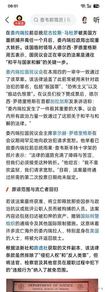 脱胎换骨? 委内瑞拉国民议会正在审议一项政府的法案,该法案似乎就是委内瑞拉庞大的拨乱反正,就是大规模的释放监狱中的政治犯、或具有一定政治性犯罪的大批人员。 无论任何一个国家,如果要改变政治面貌或对国家的社会状态进行深刻改革,大概首先必须要对人、当然主要是有政治身份的人的改变。 与之同时,该法案如果获得了通过,还将撤销对流亡海外的各种具有政治意义的人物的国际通缉。因此,这些避难于委内瑞拉国外的人,估计可以安全的顺利回国,并参加政活动。 那么,委内瑞拉如果再次举行大选,其政府领导人有可能发生天翻地覆的变化。委内瑞拉的现任领导人德尔西·罗德里格斯不会不知道这一点。但自从美国控制了委内瑞拉总统马杜罗,在美国面前,罗德里格斯估计也只有恭敬不如从命。
