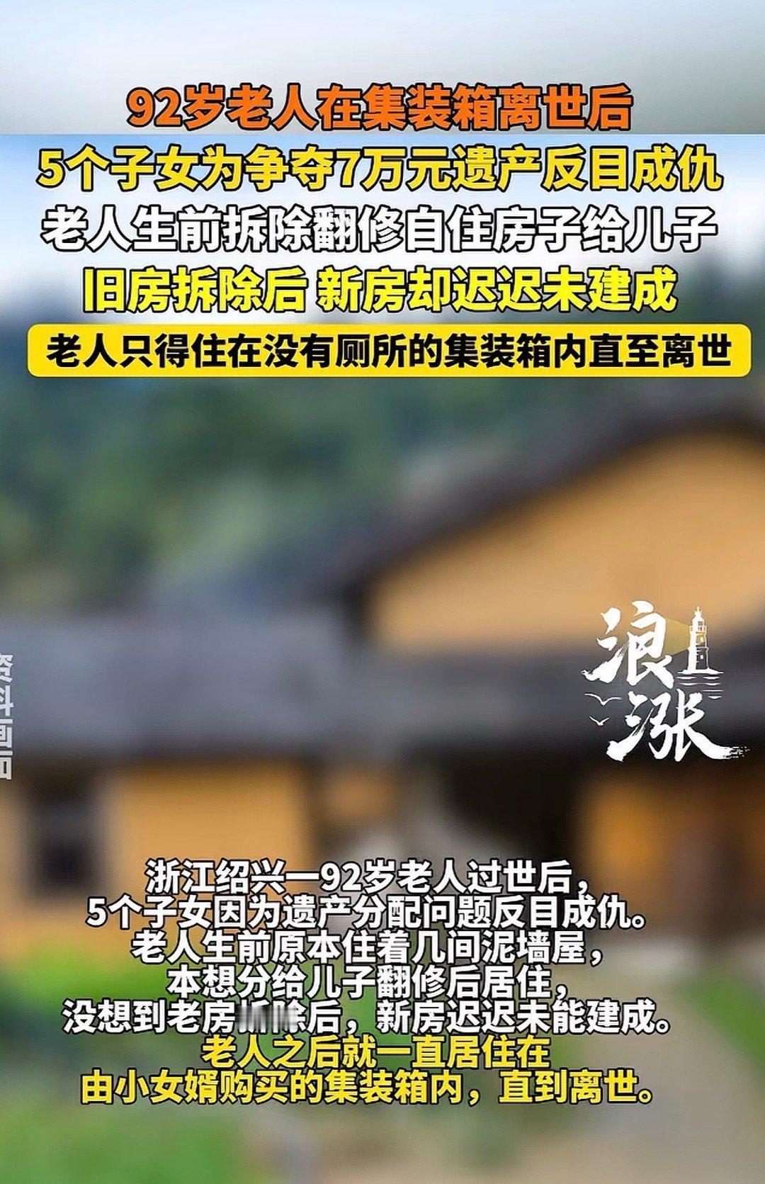 浙江绍兴一位92岁老人在集装箱里住了十年,老人一生节俭攒下19万存款,5个子女却为扣除12万丧葬费后仅剩的7万元遗产反目成仇,甚至集体退出家族群断绝联系。 在浙江绍兴的一个角落里,曾经住着一位92岁的老人。他原本有几间泥墙房,那是他生活了大半辈子的地方。老人想着,把这老房子分给儿子翻修,以后自己也能住得舒服些。可谁也没想到,老房子拆了之后,新房却迟迟没能建起来。就这样,老人没了住处,只能搬进一个集装箱里。这个集装箱,还是小女婿掏钱买的,成了老人临时的"家"。 这一住,就是整整十年。集装箱里没有厕所,连最基本的生活设施都不齐全。老人年纪大了,行动不便,日常排泄都成了大问题。没办法,只能由两个女儿轮流来清理。,一个九十多岁的老人,本该是儿孙绕膝、安享晚年的年纪,却要在逼仄的铁皮箱子里度过余生,连上个厕所都要靠女儿帮忙,这日子该有多心酸。 但老人是个要强的人,也是个节俭的人。他有劳保收入,虽然不多,但足够维持基本生活。他从不向子女伸手要钱,怕给儿女添麻烦。就这样,一分钱掰成两半花,一点一点地攒,竟然攒下了19万元的存款。这19万,是老人用十年集装箱生活换来的,是他晚年最后的底气和慰藉。他可能想着,这笔钱留着应急,或者等自己百年之后,分给子女们,也算是一份心意。 可老人万万没想到,这笔钱最后却成了撕裂亲情的利刃。老人离世后,丧事办得倒是"风光",前前后后花了12万元。扣除这笔丧葬费,原本19万的存款只剩下7万元。就是这7万元,让5个子女彻底反目。他们为了怎么分这笔钱争执不下,吵得面红耳赤,最后竟然集体退出了家族群,互相断绝了联系。血脉亲情,在区区7万元面前,碎得稀烂。 老人有5个子女,生前却住在集装箱里十年,无人问津;死后子女们却为了比丧葬费还少的遗产争得头破血流。那12万的"大操大办",与其说是为了送老人最后一程,不如说是做给外人看的面子工程。老人活着的时候,怎么没人想着给他盖间像样的房子?怎么没人接他回家同住? 更让人心寒的是,老人明明有劳保,没增加子女负担,晚年生活质量却堪忧。那间集装箱,夏天热得像蒸笼,冬天冷得像冰窖,没有厕所,没有像样的床铺。老人就这样熬了十年,熬到了92岁。他攒下的每一分钱,都是省吃俭用从牙缝里抠出来的,可能连顿像样的饭都舍不得吃,连件新衣服都舍不得买。他以为存钱能换来安全感,能换来子女的孝顺,却没想到最后换来的是一场闹剧。 这场悲剧最刺痛人心的地方,不是老人的贫穷,而是子女的凉薄。法律规定的赡养义务,成了一纸空文;几十年的养育之恩,抵不过几万块钱的诱惑。老人用十年集装箱生活告诉我们,有时候钱买不来晚年的幸福;子女们用一场遗产争夺告诉我们,亲情在利益面前可以如此脆弱。如今老人已经离世,留下的不只是那19万存款,更是一面照见人性的镜子,照出了"薄养厚葬"的虚伪,也照出了老龄化社会里最残酷的真相。农村养老集装箱 来源:陕视新闻