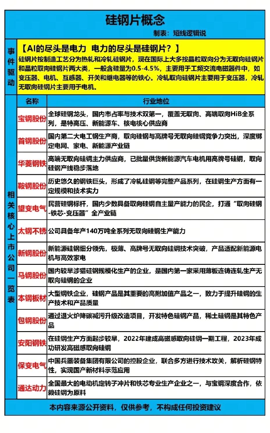 2月9日,星期一A股这个板块值得大家重点关注!!! AI的尽头是电力,电力的尽头是硅钢片,前段时间,英伟达召开闭门会议,讨论AI电力短缺相关事宜,电力板块迎来一波大行情,与电力相关的金属材料也迎来一波大行情,比如银、铜等发电金属,电力短缺影响甚远,而且短期这个问题无法有效解决!!! 而硅钢片作为交流电磁器件中重要部件,目前,板块尚在底部,后市上方空间大,重点关注:宝钢股份、太钢不锈、保变电气!!!
