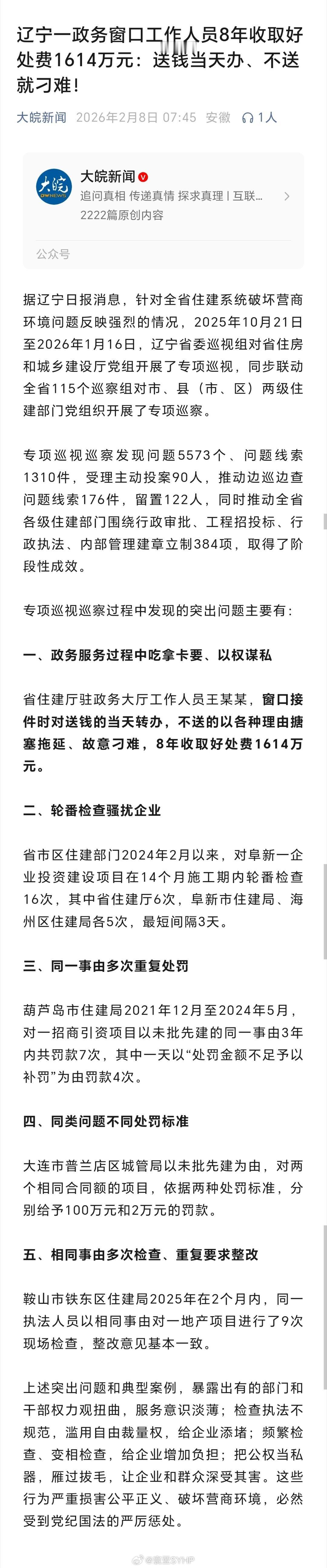 政务窗口工作人员8年收好处费1614万辽宁一政务窗口工作人员8年收取好处费1614万元:送钱当天办、不送就刁难!