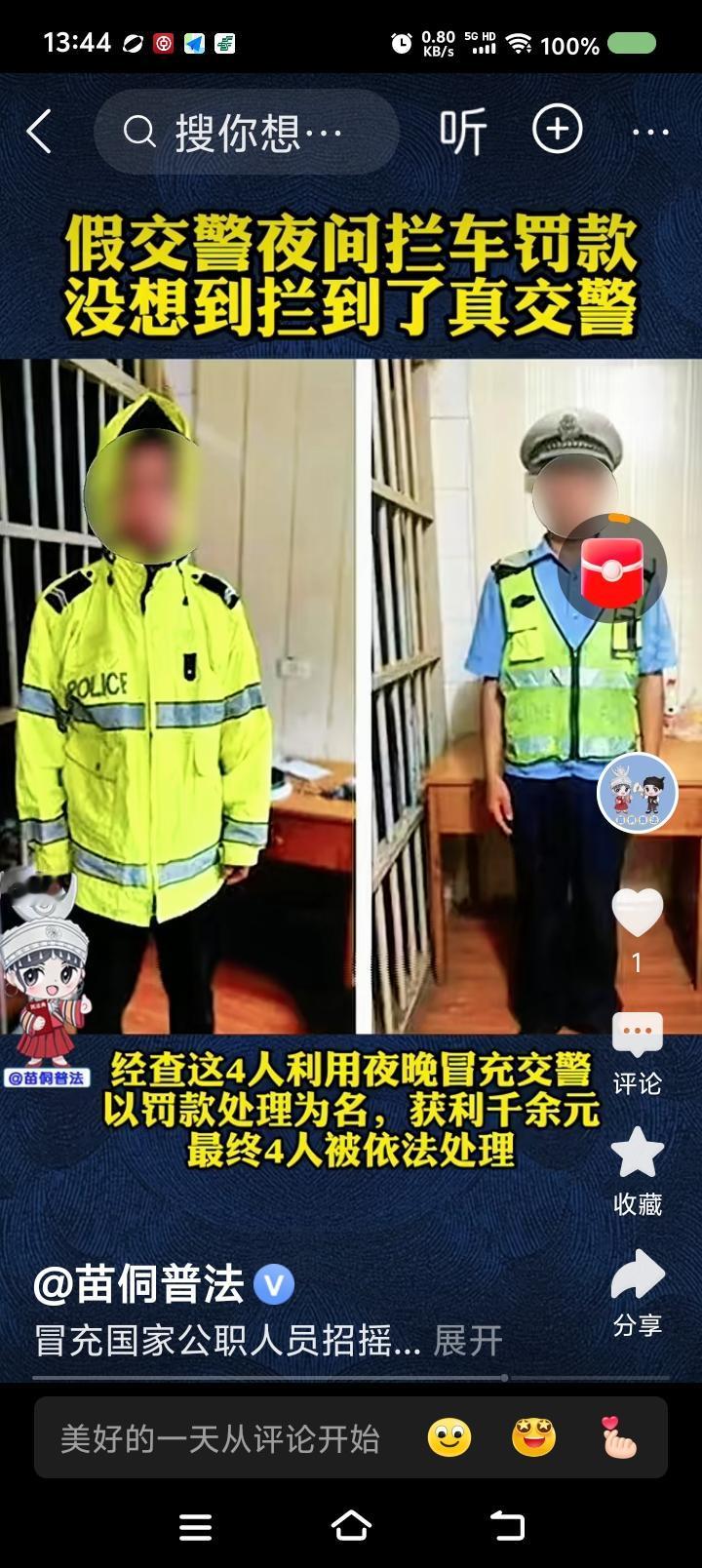 当交警遇到“交警”—— 据报道,某地交警巡查时遇到所谓的交警查车,对方说:“天黑没看清,自己人,走吧。”交警将其控制,顺藤摸瓜,抓获四人。这些人冒充交警,罚款已超过千元。 点评: 这些人的衣服、言谈举止、证件能骗到人? 匪夷所思!