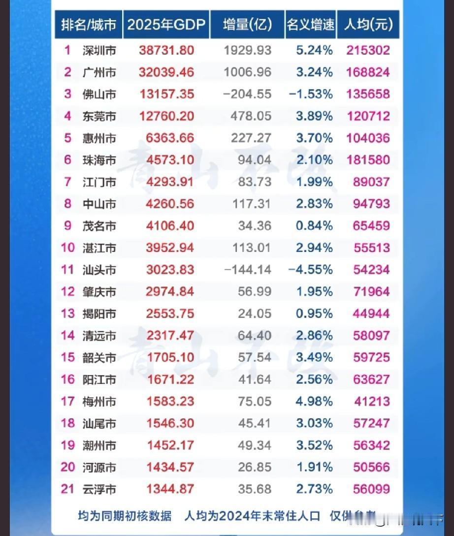 珠海,汕头,中山,潮州,广东很多城市名气大,经济数据也很一般 闲看经济数据,有一个广东2025年各市数据的汇总,看后给人的感觉就是,广东贵为中国经济第一省,省内发展也是差异巨大,深圳,广州可以说是一市顶一省的实力(中小省份)。 深圳3.87万亿,云浮1300亿,第一和倒一的差距,也是国内省份里差距最大的。 人均GDP从21万到5.6万都有。 再看看珠海,汕头,中山,潮州等市,经济体量也就是4000多,3000多亿,1000多亿,也就是其他省份普通地级市的水平,但是它们的名气非常大。 广东的经济实力是国内第一梯队,但是要论省内发展不均衡问题,广东应该也是国内第一梯队,21个地级市,用句不好听的话形容,有人在坐火箭,有人在坐拖拉机。广东经济增速 广东城市排行 广东经济第五城 广东各市排名 潮汕经济 中山GDP 汕头经济环境
