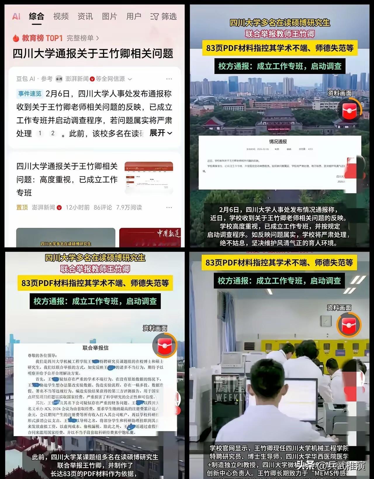 四川大学的校长此时此刻可能也是一个头两个大吧, 川大博导被三十多名学生联名举报,这下校长彻底头疼了,这事儿看得太解气! 2月6日,川大机械工程学院的博导王某,被课题组硕博士生联名举报。三十多个学生一起出手,整理了83页的举报材料,里面有聊天记录、经费流水还有实验截图,证据摆得明明白白。 举报的问题可不少,学术不端、经费违规、师德失范,还有政治立场的问题。这人本身和家属都有日本永住权,还偏要把中日韩国际会议开幕式定在9月18日,根本没把这个特殊日子当回事。 有网友说,更过分的是,2025年涉台的一场会议上,他强迫学生投稿,公然违背一个中国原则。就这种人,居然能在国内顶尖学府当博导,真让人难以接受。 听说学校校长早就知道这人有问题,可当初人才引进把人招进来,没硬理由根本没法让他走,这下好了,学生的举报直接把事情摆到了台面上。 笔者认为,为这些勇敢的学生点赞!他们敢站出来发声,守住了底线。这种德不配位的博导,必须彻底清除出高校队伍,绝不能姑息,希望学校能秉公处理,还学生公道! 对此,你怎么看呢?